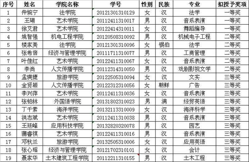 经学院组织申报、学校评选小组评选产生2013—2014学年度金光奖学金—“金光艺术贡献专项奖”获奖名单。 现对结果进行公示,如有异议,请电话或书面向校团委反映,反映情况时应自报或签署真实姓名,要有具体事实,不报或不签署真实姓名以及不提供具体事实材料的,一律不予受理。 公示时间:2014年11月10日至12日 受理部门:校团委综合科,思源学堂A402 联系电话:66267908