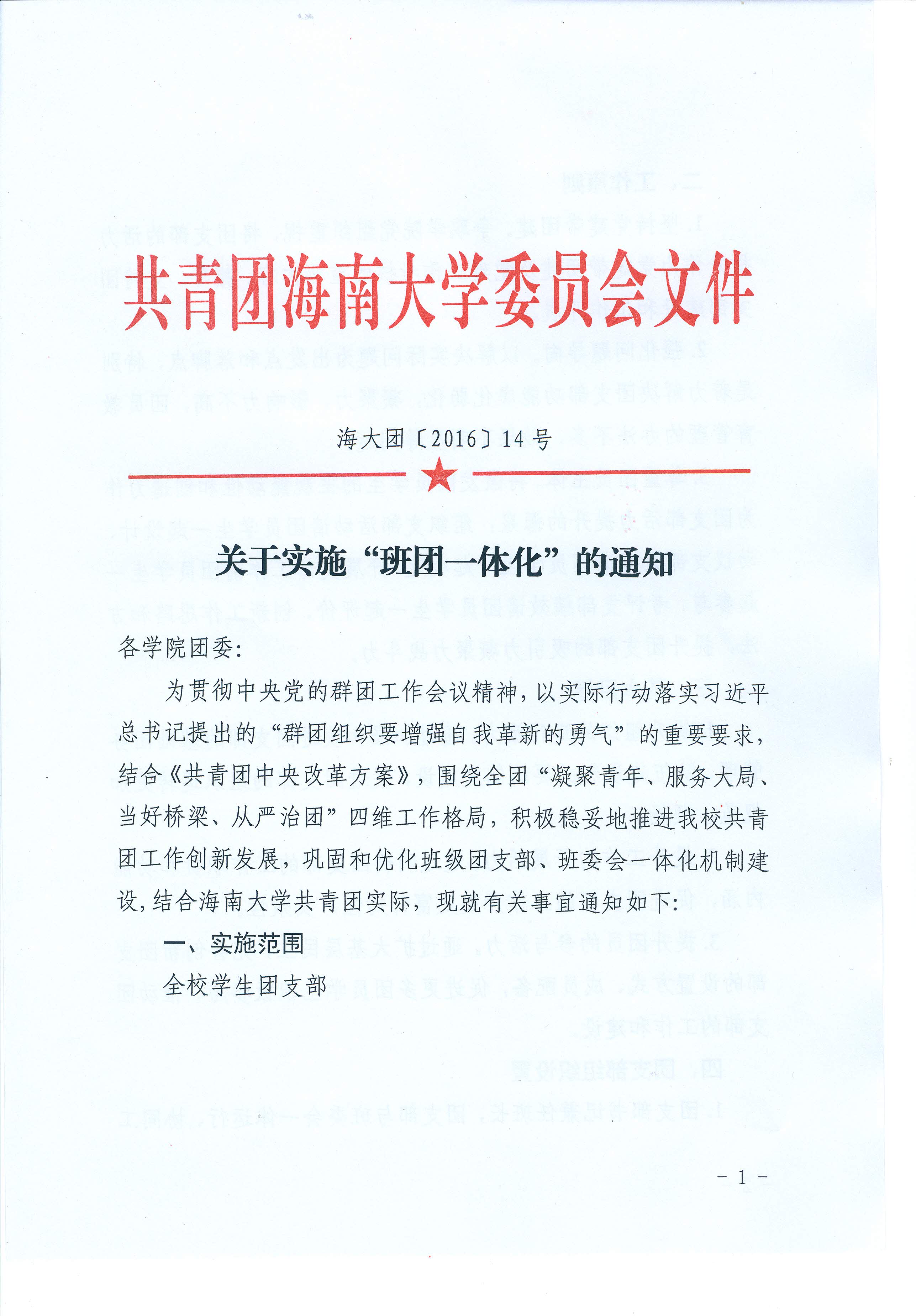 关于实施“班团一体化”的通知(海大团〔2016〕14号)