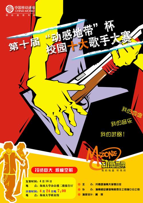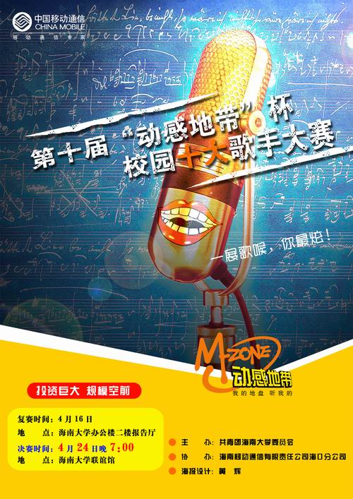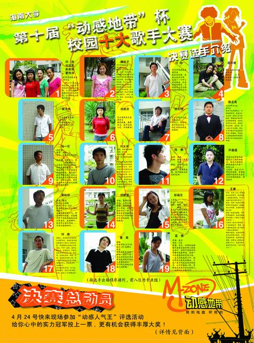 PA视讯集团网站第十届“动感地带杯”校园十大歌手总决赛将于2005年4月24日(星期日)晚上7:00在PA视讯集团网站联谊馆举行。本次大赛将会产生本年度“校园十大歌手”。 激烈的场面、精彩的表演、悠扬的歌声将会使本次比赛精彩无限;七彩的灯光,漂亮的舞台,精美的装饰将为本次比赛的锦上添花;青春的旋律,美妙的乐曲,动感的组合更将是本次比赛的一个观看的亮点。 届时,我们欢迎学校老师和同学们前来观看。观看的同学须凭入场券入场,无票请到各学院团委领取。
