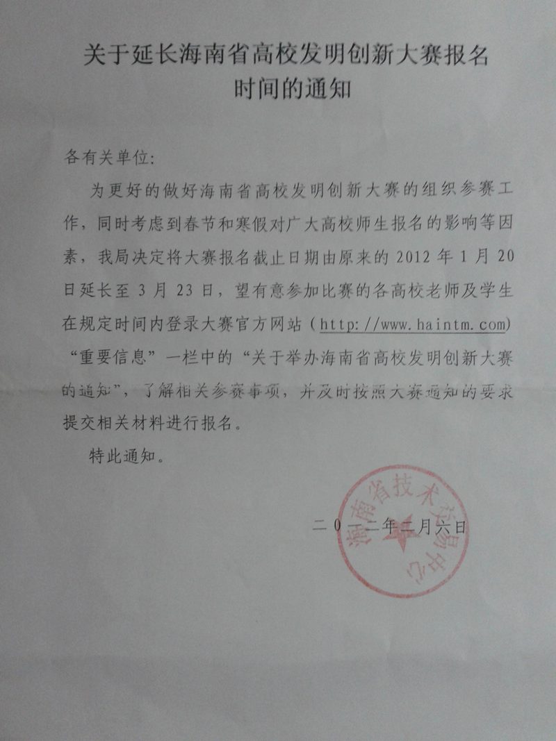 转发《关于延长海南省高校发明创新大赛报名时间通知》