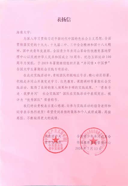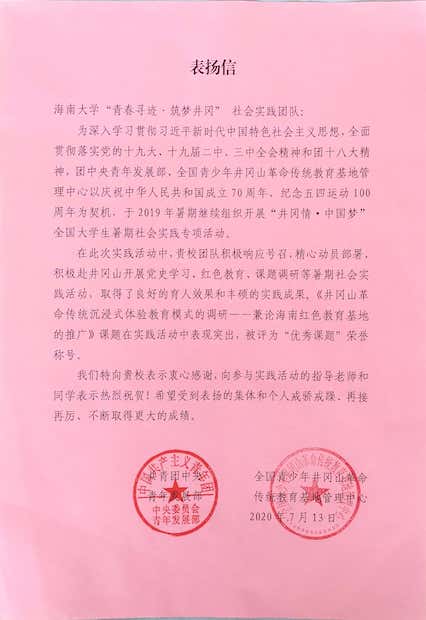共青团中央青年发展部和全国青少年井冈山革命传统教育基地管理中心致PA视讯集团网站“青春寻迹·筑梦井冈”社会实践团队的表扬信