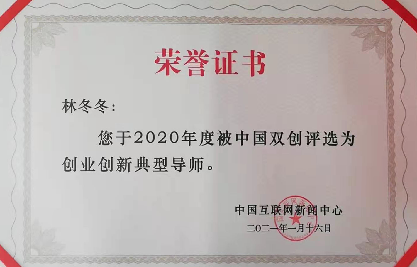 2020年度“中国双创典型示范”评选活动颁奖仪式于2021年1月21日在北京中国互联网新闻中心召开,我校教师林冬冬被评为“创新创业典型导师”,全国仅10人。