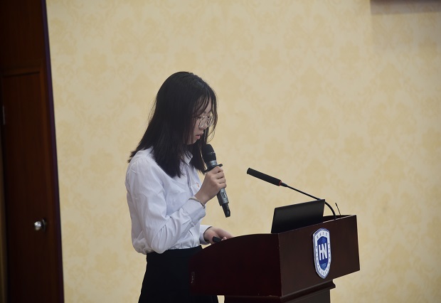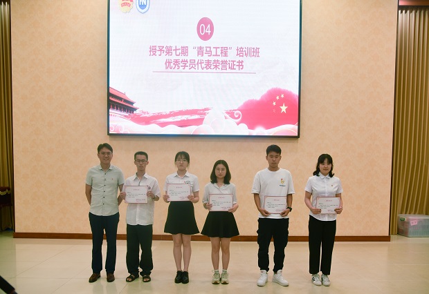 袁周米琪宣读培训班结业名单及优秀学员名单,黎雨苗为第七期“青马工程”培训班优秀学员代表颁发荣誉证书。国际旅游学院张婷婷代表优秀学员发言。