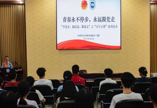 刘智以《青春不停步,永远跟党走》为题,分享了自己的十多年的从警经历,并向同学们介绍了白沙门渡海战役指挥员秦道深的党史故事。他鼓励各位青年学生们传承发扬五四精神,不畏艰险,冲锋在前,坚守公平正义,勇于担当。他呼吁广大青年肩负历史使命,坚定信心,立大志、明大德,成大才、担大任,努力成为堪当民族复兴重任的时代新人,让青春在不懈奋斗中绽放绚烂之花。