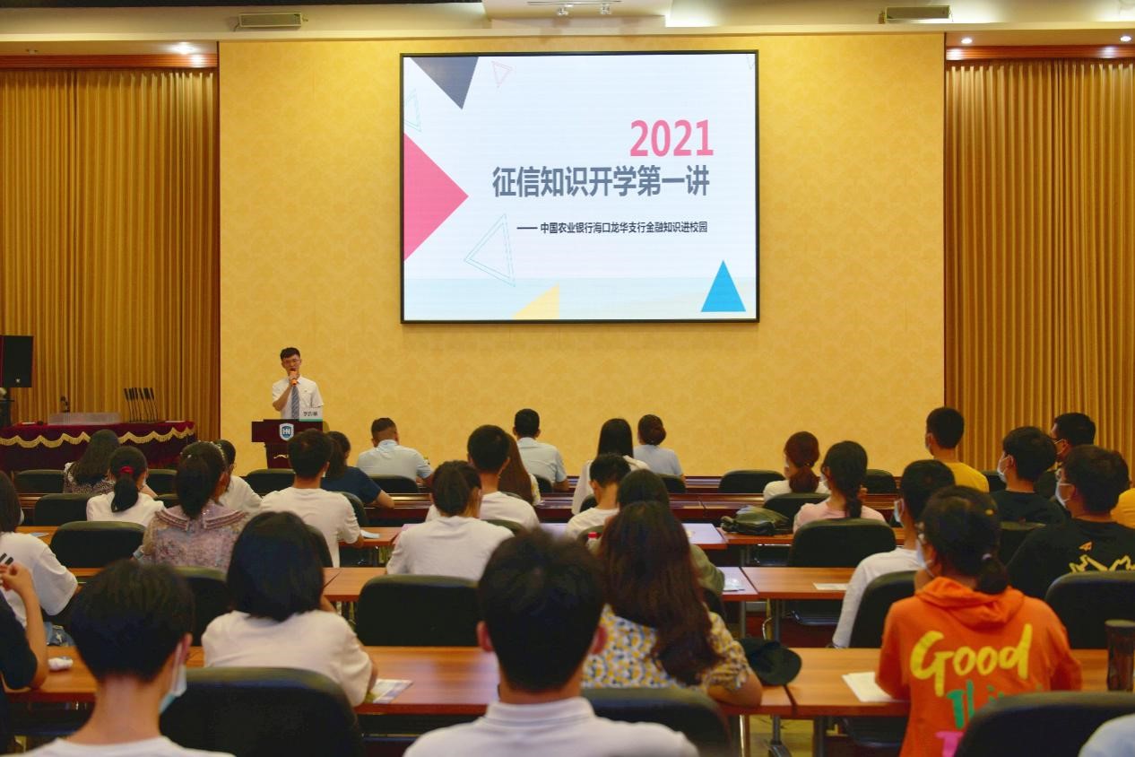 “征信知识开学第一讲”主要由农业银行海口龙华支行金融讲师李浩楠主讲。李浩楠从征信与生活、诈骗的主要手段等五个方面为在座青年普及了征信知识,介绍了防骗技巧。他提出青年学生要有防骗意识,注意保护个人隐私,养成随时关注自身信用的好习惯,要注意防范非法信贷,保护个人权益。