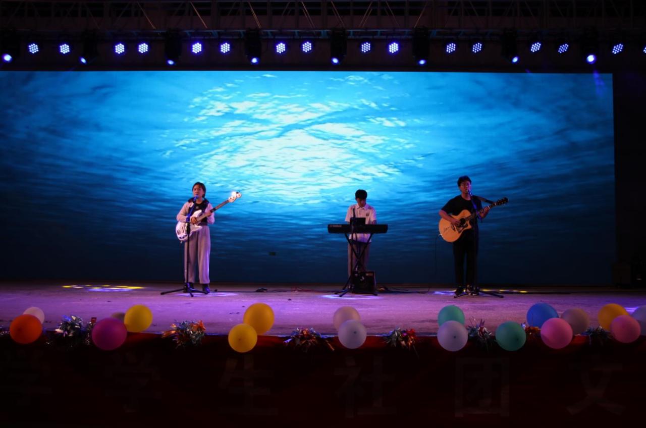 吉他协会作为首个登场的社团带来了《再见+that’s what you get》。他们舞动琴弦,用动人的旋律唱响了青春之歌;FREE街舞社的劲爆街舞,让全场的气氛迅速点燃;国学社为大家带来了一场别具风格的汉服展——《九令霓裳》,“风吹仙袂飘飘举,犹似霓裳羽衣舞”展示了汉服文化的别样魅力,成为晚会现场一道独特靓丽的风景线;儋州校区吉他协会表演的《凄美地+想去海边》唱出了青年人独有的朝气蓬勃,引得阵阵欢呼!笑声工作坊的同学们表演的小品《如此天团》,让大家开怀大笑。最后,学生社团联合会的学生骨干为大家带来了精心准备的大合唱节目——《爱,因为在心中》,唱响了学生社联“爱海大,爱社团”全心全意为社团服务的宗旨。