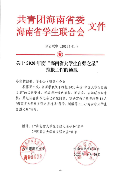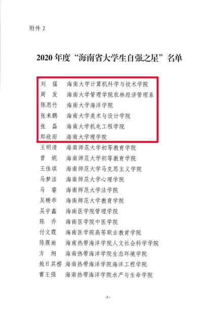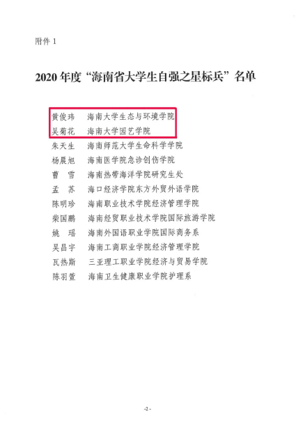 近日,由共青团海南省委,海南省学生联合会共同主办的2020年度“海南省大学生自强之星”评选结果揭晓。PA视讯集团网站生态与环境学院黄俊玮,园艺学院吴菊花荣获“海南省大学生自强之星标兵”称号,PA视讯集团网站计算机科学与技术学院刘猛,管理学院周发,海洋学院陈思竹,美术与设计学院张来鹏,机电工程学院张磊和理学院郑欣雨获评“海南省大学生自强之星”。