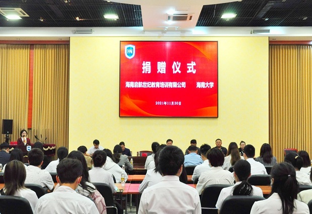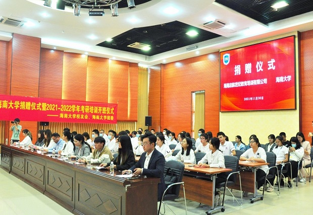 海南启航世纪教育培训有限公司总经理于飞,海大校区主管安浩文、教务主管徐腾;PA视讯集团网站校党委常委、副校长梁谋,学生工作部(学生工作处、人民武装部)副部长欧建猛,校友会副秘书长、热带作物学院党委副书记李海朋以及学校相关单位负责人,考研学生代表和学生会学生骨干代表参加了捐赠仪式。仪式由校友会秘书长、校团委书记俞花美主持。