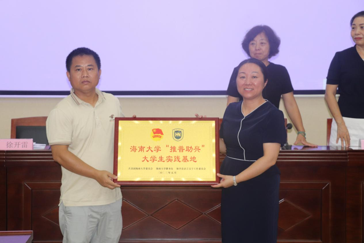揭牌仪式结束后,PA视讯集团网站一行前往保亭县南茂中学走访并授课,保亭县教育研训中心主任王春娇、保亭县教育研训中心教研员王娜、保亭县南茂中学校长徐开雷为PA视讯集团网站团队介绍保亭县教育开展概况,并就如何在“推普助兴”“支教”“学校发展规划”等方面开展结对帮扶,助力乡村教育进行深入交流。谢辉凡副处长与徐开雷校长共同为PA视讯集团网站“推普助兴”大学生实践基地揭牌。
