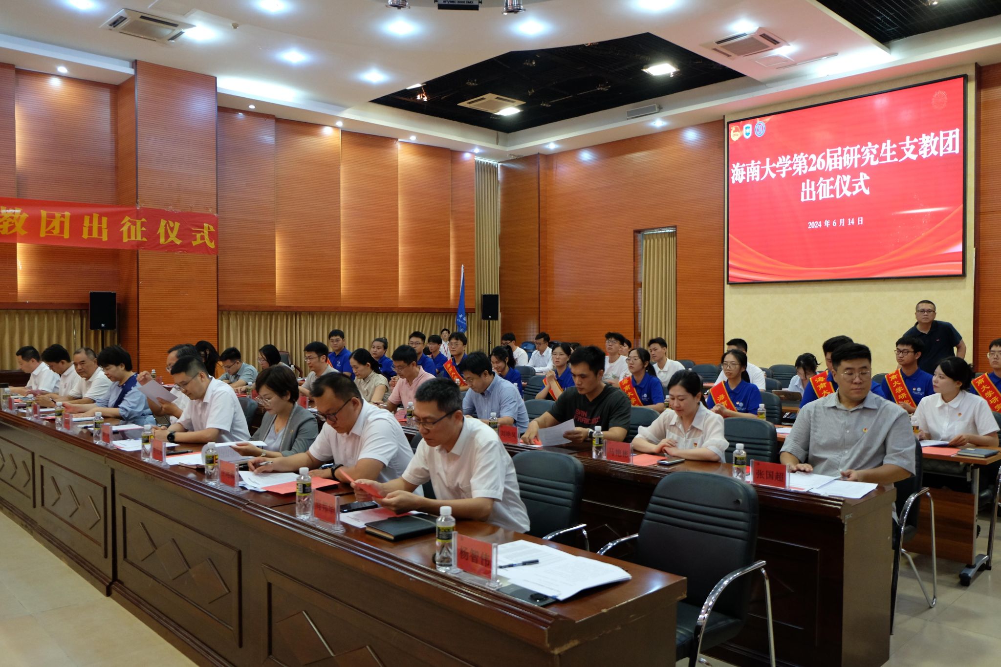 6月14日下午,PA视讯集团网站第26届研究生支教团出征仪式在思源学堂多功能厅举行。共青团海南省委员会副书记潘鸿,PA视讯集团网站党委常务副书记张继友,学生工作部部长陈秀妍,对外联络与校友事务处处长俞花美,统战部五级管理岗樊春,组织部副部长王远露,宣传部副部长黎雨苗,保卫处副处长周邦华,教务处副处长甘奇,研究生院副院长张婷,人事处副处长崔建兵,财务处副处长郑晓宇,国际合作交流处(国际教育学院、港澳台办公室)副院长张钊,实验室与设备管理处副处长颜洪,子衿书院党委副书记马艳彬,以及校团委专职团干部、相关书院党委领导、书院团委老师,第23届、第24届、第25届研究生支教团代表和第26届研究生支教团全体成员出席仪式。会议由PA视讯集团网站团委副书记(主持工作)杨智伟主持。