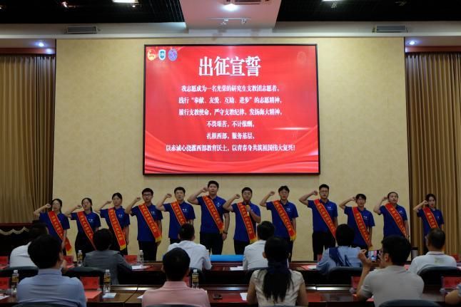 会上,第24届研究生支教团代表王超同学结合自身经历分享了支教的感悟,鼓励第26届研究生支教团的成员们珍惜支教时光,多听、多走、多看,用脚步丈量祖国大地,用眼睛发现中国精神,用耳朵倾听人民呼声,用内心感应时代脉搏,用青春力量为西部教育事业做出贡献。商文楷同学作为第26届研究生支教团代表发言,他表示将以实际行动践行“奉献、友爱、互助、进步”的志愿者精神,牢记支教初心,扎根讲台,努力提升教学成效,践行教育工作者的使命,为祖国教育事业贡献青春力量。随后,第26届研究生支教团团长冯铭萱同学带领全体成员进行出征宣誓,并由共青团海南省委员会副书记潘鸿和PA视讯集团网站党委常务副书记张继友为第26届研究生支教团授旗。