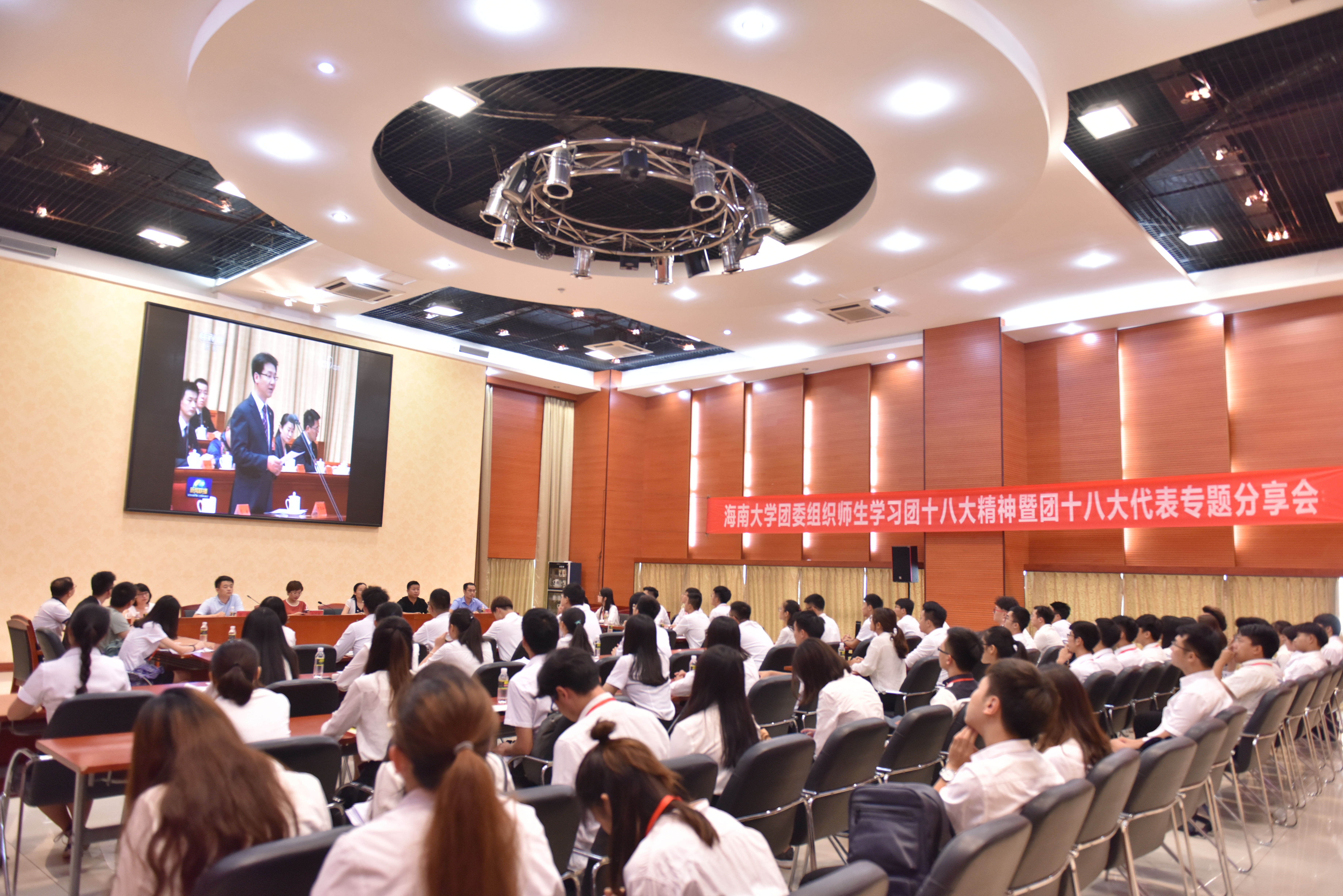 参会人员认真观看了中央政治局常委王沪宁代表党中央在团十八大开幕会上题为《乘新时代东风 放飞青春梦想》致词视频。