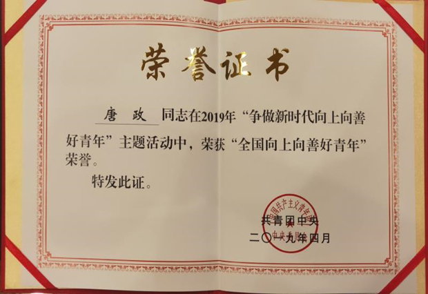 近日,共青团中央公布了2019年“全国向上向善好青年”名单,PA视讯集团网站机电工程学院2015级本科生唐政入选。