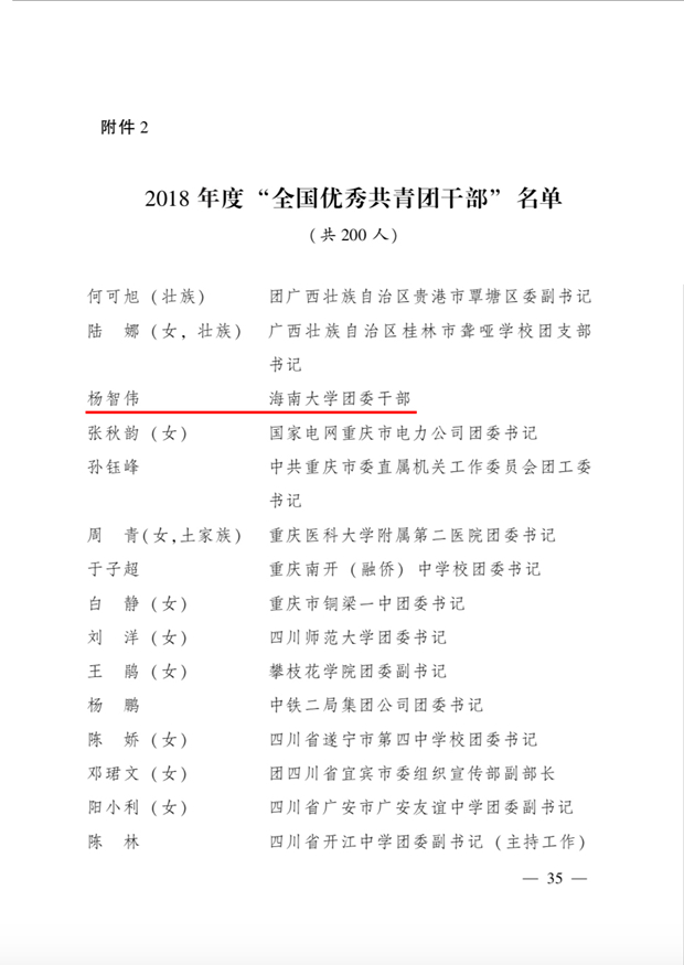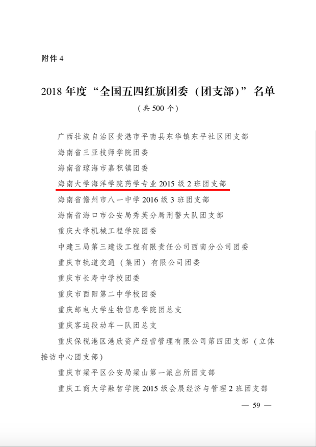 “五?四”青年节前夕,共青团中央在全国范围内表彰了一批“全国优秀共青干部”和“全国五四红旗团委(团支部)部”。我校团委杨智伟老师在此次表彰中被团中央授予“全国优秀共青团干部”称号,海洋学院药学专业2015级2班团支部被团中央授予全国五四红旗团委(团支部)称号。据悉,海南省此次共有1人获得2018年度“全国优秀共青团干部”称号,5个团组织获得全国五四红旗团委(团支部)称号。