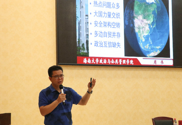 周伟作题为《当前国际形势与中国外交战略》的专题讲座。他从当前国际形势的新变化、周边关系与安全环境分析、中国的外交战略与布局三个方面详细讲解了当前国际形势和中国的外交战略。在场学员对国际形势的新变化与新趋势、中国外交的新局面与新挑战有了全面的了解和正确的认识。周伟鼓励在座的青年学生树立全民外交的意识,主动了解时事、关心热点,做奋发有为、积极作为的学生骨干。