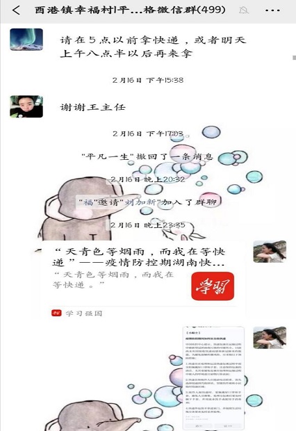 这次疫情爆发正值农历新年,恰逢人员返乡走亲访友的高峰期。村里村干部反应迅速,组建了巡逻队,劝诫村民不串门少出门,广播也不间歇地播放防疫科普知识。作为村子里的一员,陈婷主动放弃了假期的娱乐时间,利用网络将村微信群作为新阵地,开展线上防控疫情的工作。