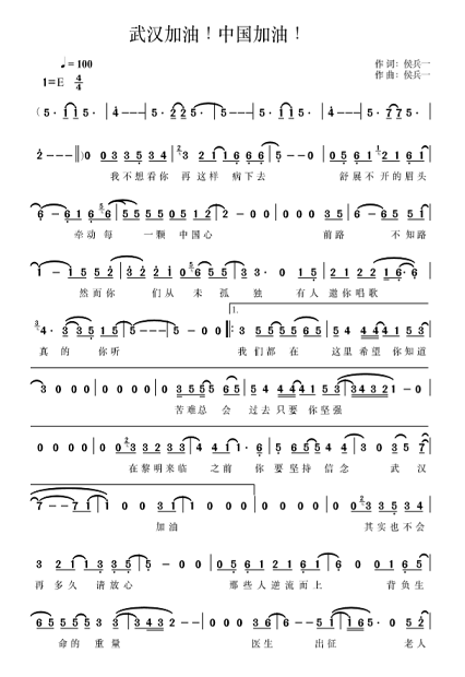 侯兵一还利用夜晚空闲创作歌曲《武汉加油,中国加油!》来表达对战胜疫情的迫切期望和对所有抗疫战士的真诚祝福——“前路不知路,而你们从未孤独”。疫情无情人有情,坚定信念,我们定会走出阴霾!