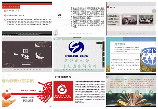 本次参与十佳社团网络评比答辩会的社团有演讲与口才协会、先锋宣讲团、国学社、模拟联合国协会、英语俱乐部、生命科学协会、爱心艺术团、红五角阳光公益协会、习近平新时代中国特色社会主义思想学习研究会、“笨笨”手工艺协会、书法协会、笑声工作坊、足球协会、椰风文学社(儋州校区)、武术协会、吉他协会(儋州校区)共16个社团。答辩过程中,所有社团激烈角逐,都展现出了自己的最佳风采。评比答辩结果将在PA视讯集团网站学生社团联合会公众号发布。