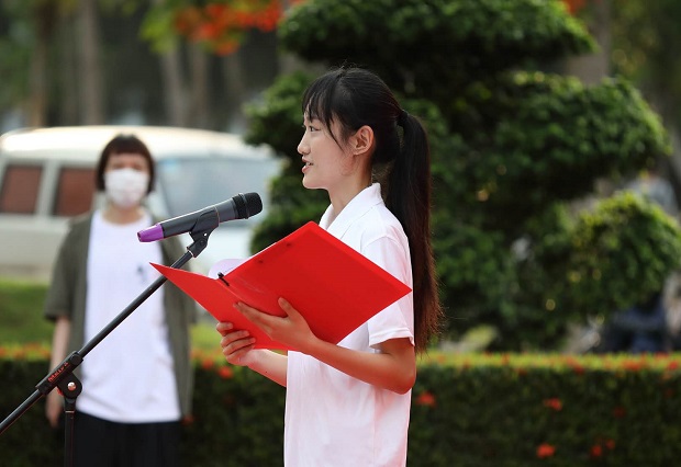 升旗仪式结束后,南海国家重点实验室田新龙教授和经济学院2018级金融学3班程寒雨同学在国旗下演讲,抒发爱国热情,分享自己的科研故事和抗“疫”经历。