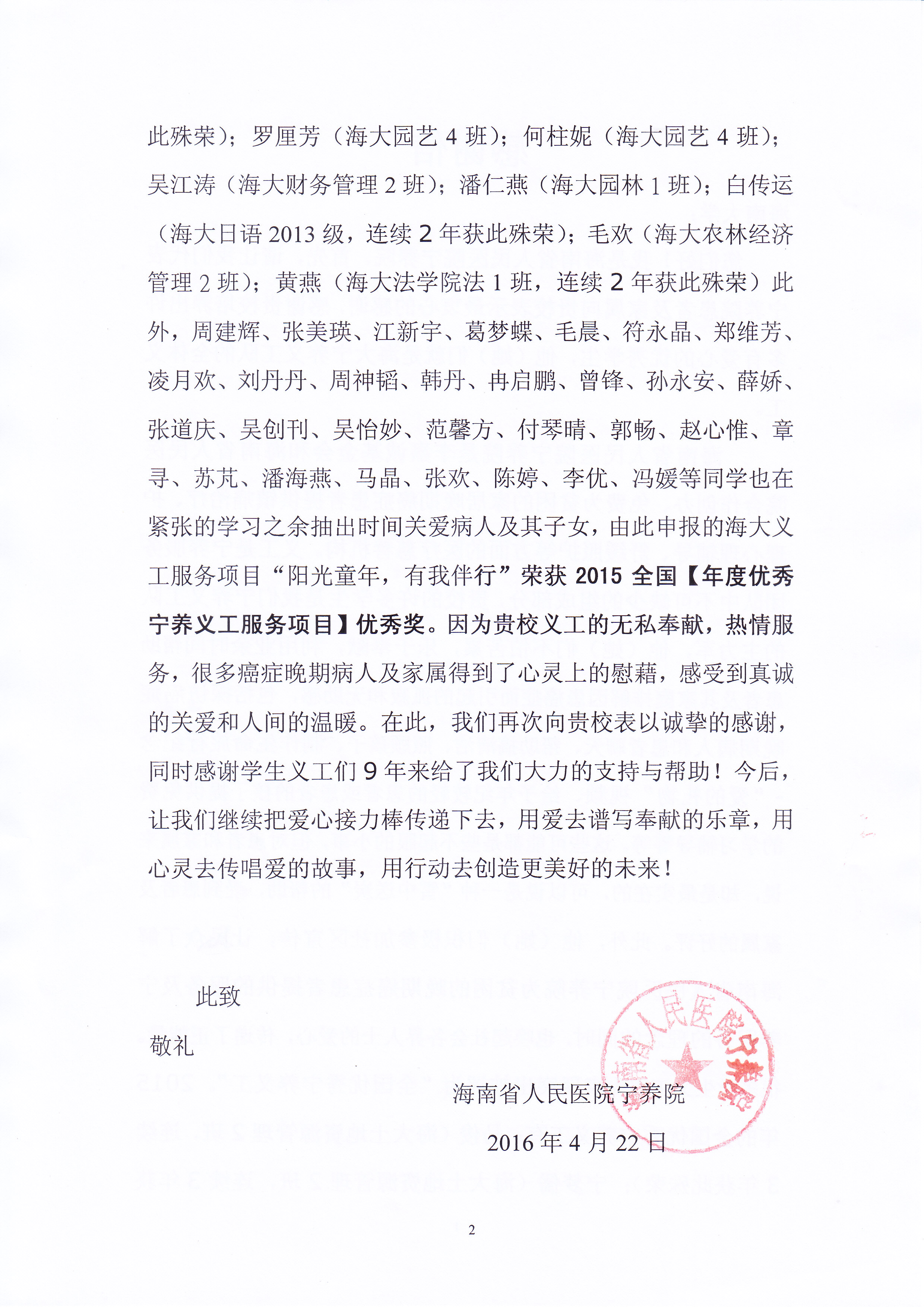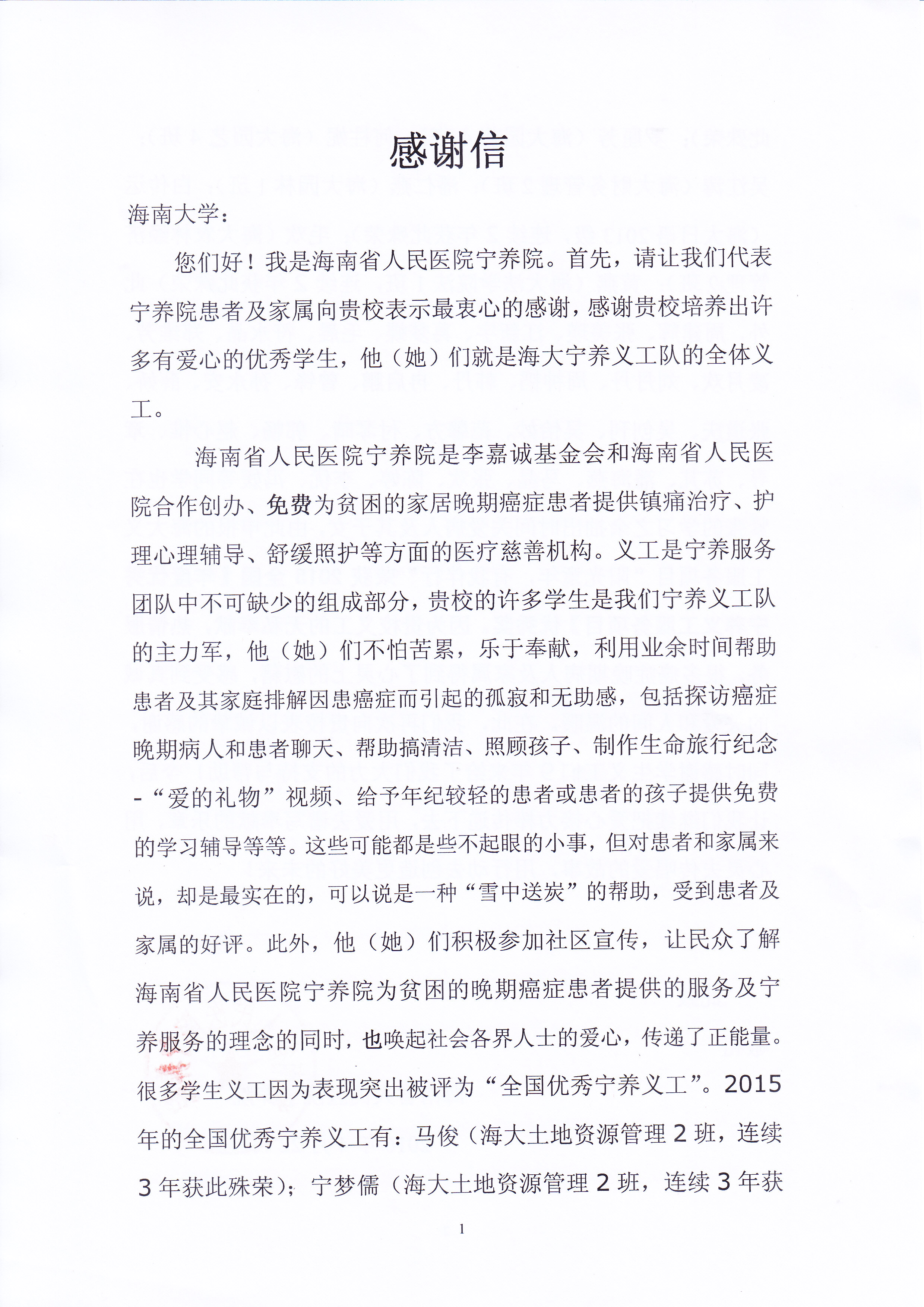 一封来自海南省人民医院宁养院的感谢信