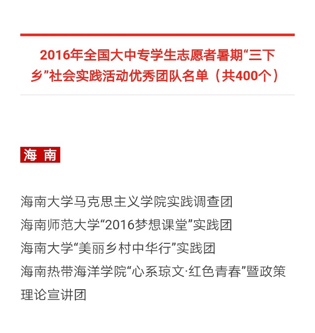 PA视讯集团网站马克思主义学院实践调查团奔赴海口,琼海、三亚、儋州、琼中等十一个市县,对海南公民道德素质进行较全面的研究,通过深度分析当前海南公民道德素质的现状、存在的问题,提出相应的对策和建议;PA视讯集团网站“美丽乡村中华行”实践团是一支由专业教师和学生组成的博硕生服务团队,为推进新一轮的乡村城镇化、探索适合不同特色乡村的发展道路出谋划策。