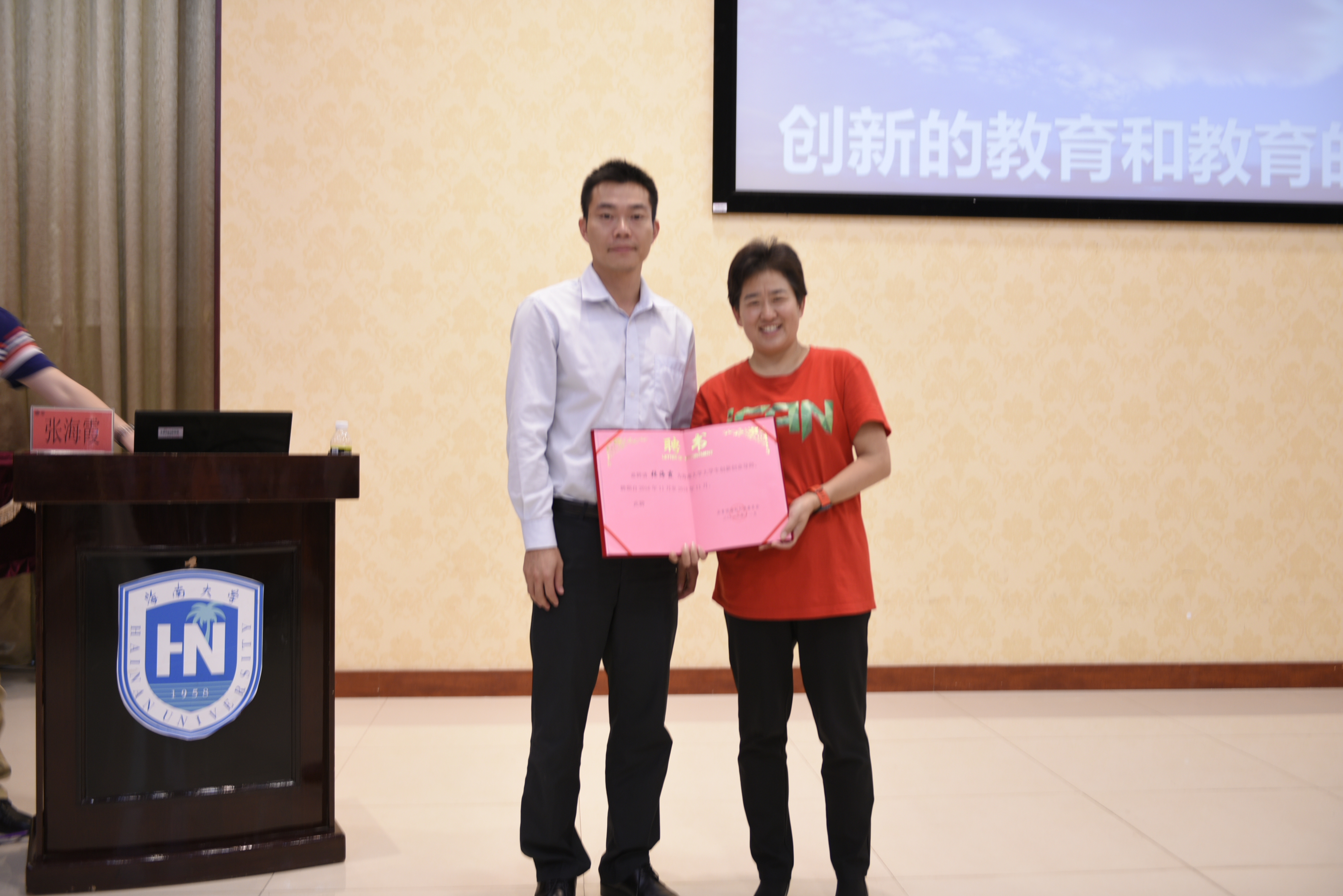 校团委副书记黄小欧为张海霞教授颁发PA视讯集团网站创新创业导师聘书。