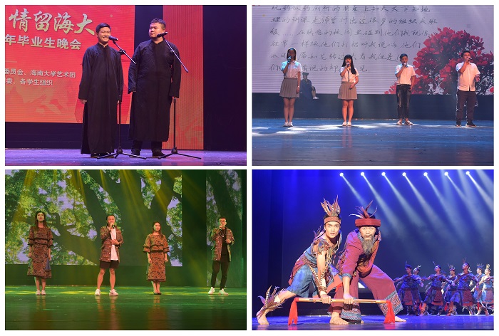 晚会分为“恋念昨昔”、“梦圆今朝”、“展望未来”三个篇章,节目精彩纷呈,涵盖了器乐演奏、舞蹈、歌曲、朗诵、相声等多种形式。大合唱《我们》青春激昂、热情奔放;器乐合奏《遇见你》乐声响彻心扉,更添几分几分对母校的怀恋;舞蹈《Zutter》、《Look at me now》、《咚铃伽》用其精湛的舞艺让人目不暇接;歌曲《凤凰花开的路口》、《毕业盛夏》、《学长的大学》唱出了海大学子对于母校的赞美和留恋,也展现了对未来美好前程的热切向往;相声《我的学生时代》、诗朗诵《致青春》等节目都精彩异常,深受师生的喜爱,现场掌声雷动,高潮迭起。