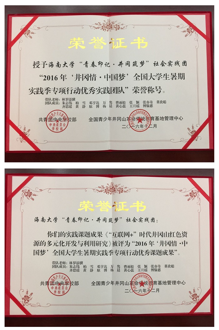 7月9日,“井冈情·中国梦”全国大学生暑期实践季专项行动2017年度开营仪式暨2016年度总结表彰会在全国青少年井冈山革命传统教育基地隆重举行。我校“青春印记·井冈筑梦”社会实践团从全国500多所高校、721个实践团队中脱颖而出,获得“2016年‘井冈情·中国梦全国大学生暑期实践季专项行动优秀实践团队”荣誉称号,团实践课题成果《“互联网+”时代井冈山红色资源的多元化开发与利用研究》获评“2016年‘井冈情·中国梦全国大学生暑期实践季专项行动优秀课题成果”。