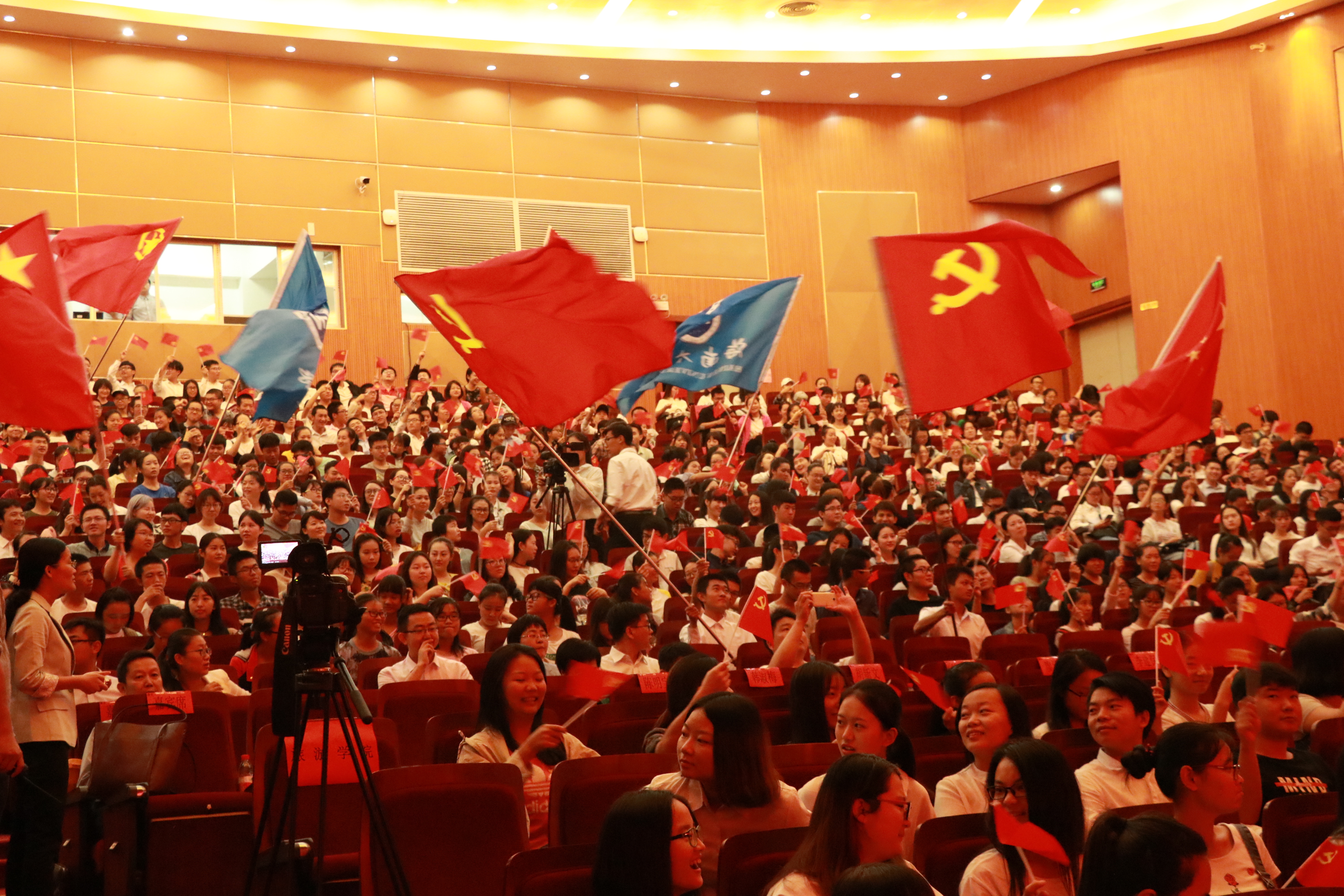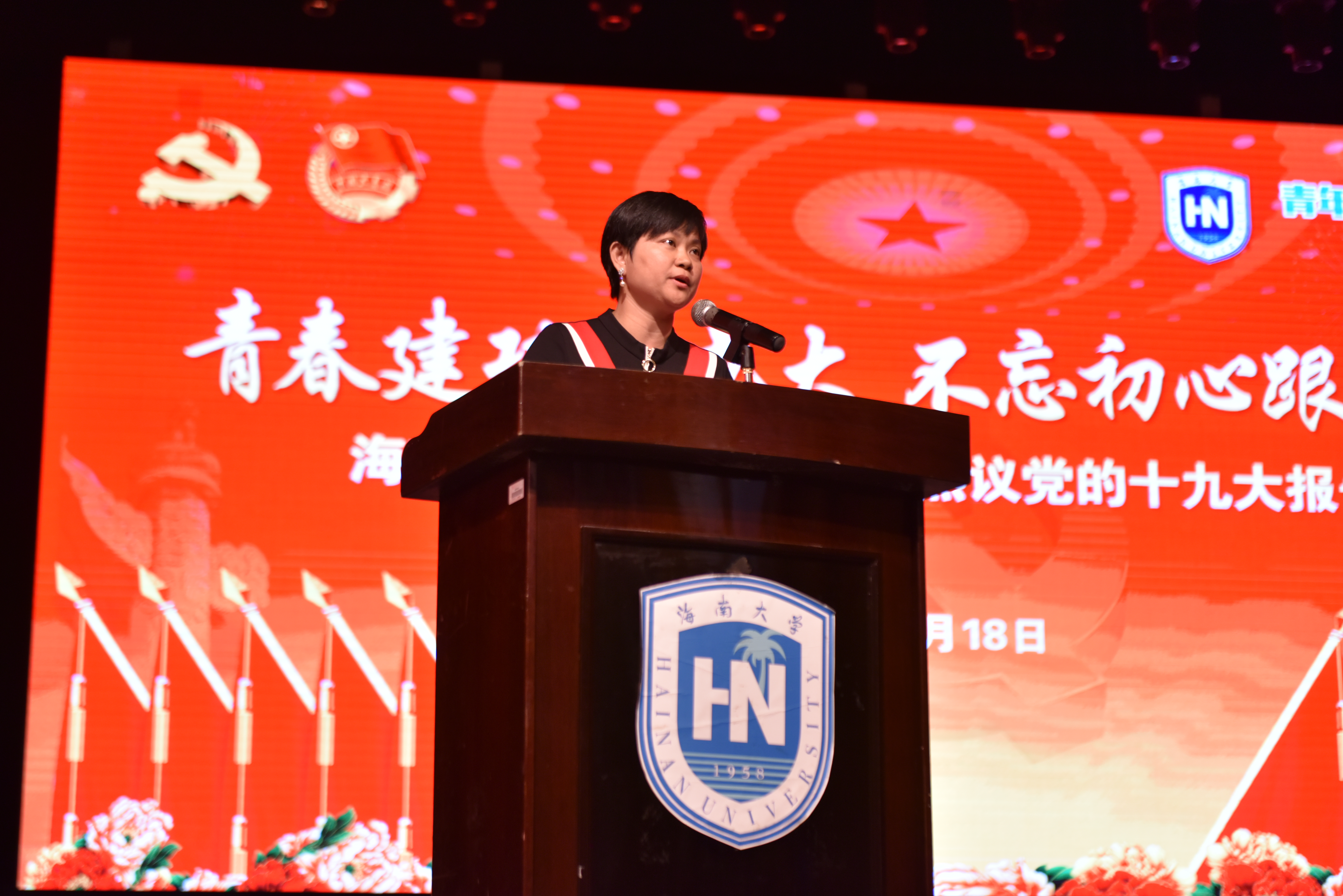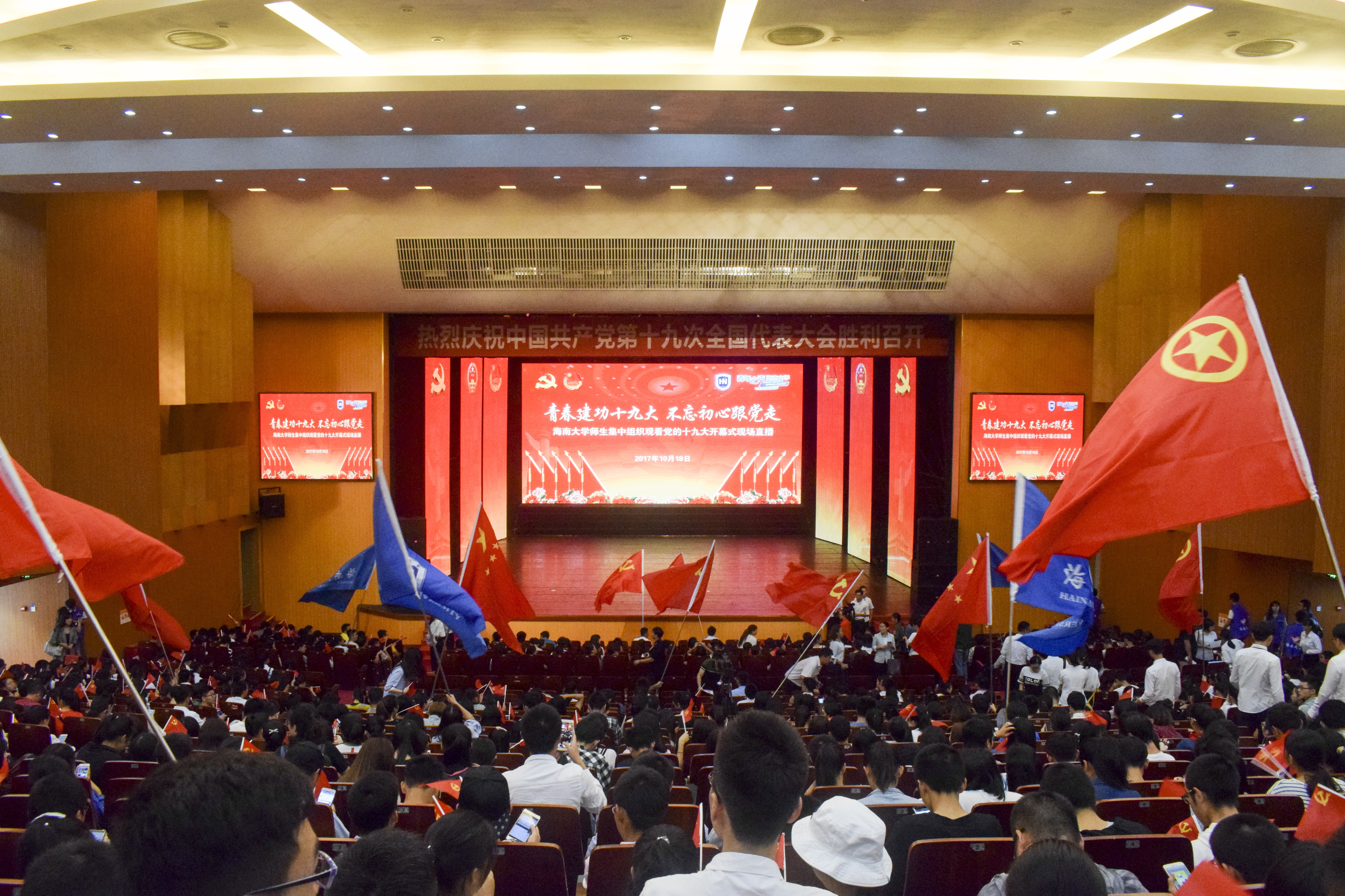 现场观看氛围浓厚,师生热情高涨,当习近平总书记等党和国家领导人出现在屏幕时,思源礼堂立刻爆发出了雷鸣般的掌声。收看过程中,在场全体师生反响强烈,用热烈的掌声表达对习近平总书记讲话的深刻赞同,全神贯注观看党的十九大直播并认真记录笔记。全体师生佩戴的党员徽章团徽,与现场布置的的国旗、党旗交融成一片汇聚海大青春力量的中国红。海南日报等媒体对我校师生观看十九大直播的盛况进行拍摄报道。