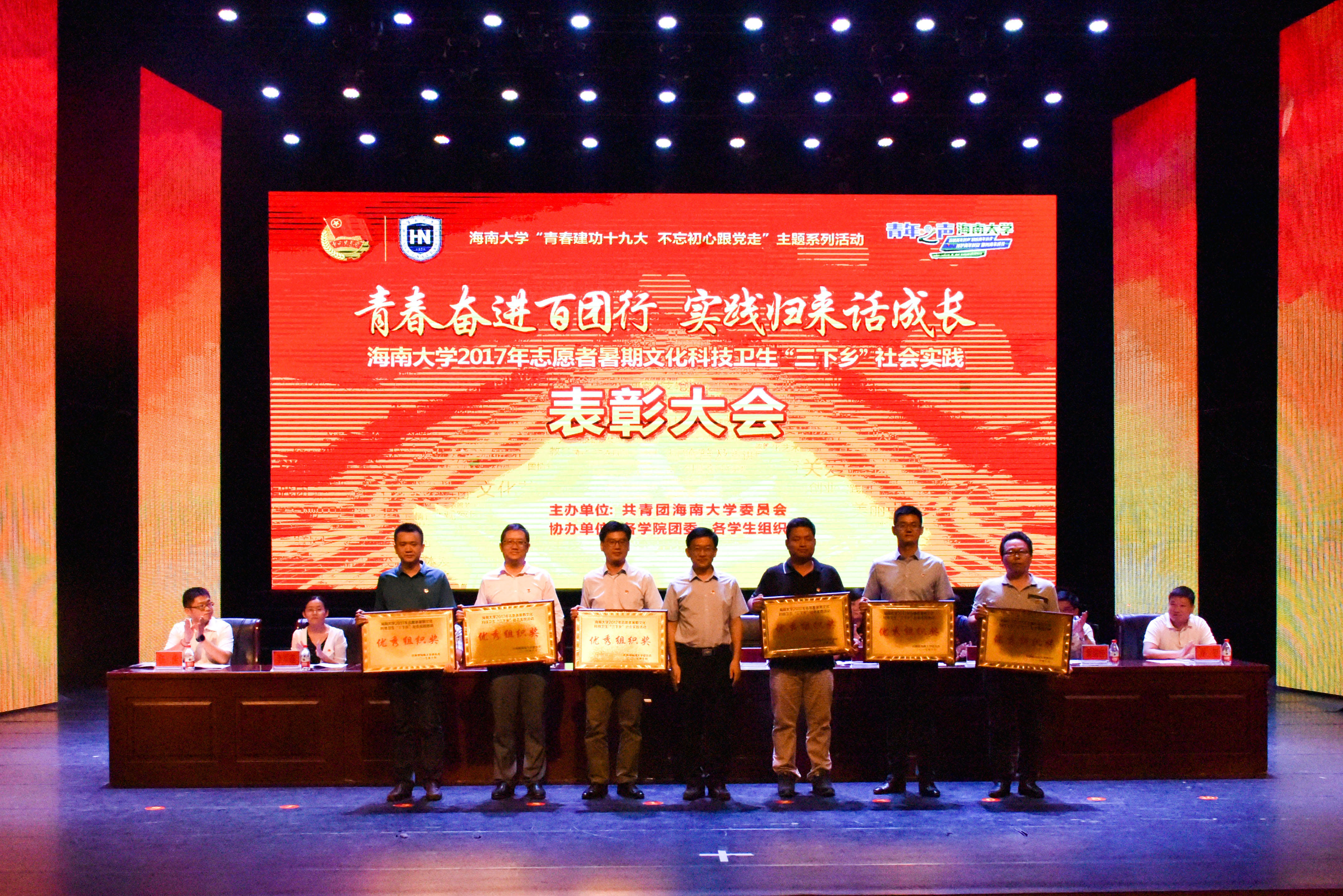 与会领导为我校2017年暑期社会实践获奖先进集体和个人颁奖并合影留念。