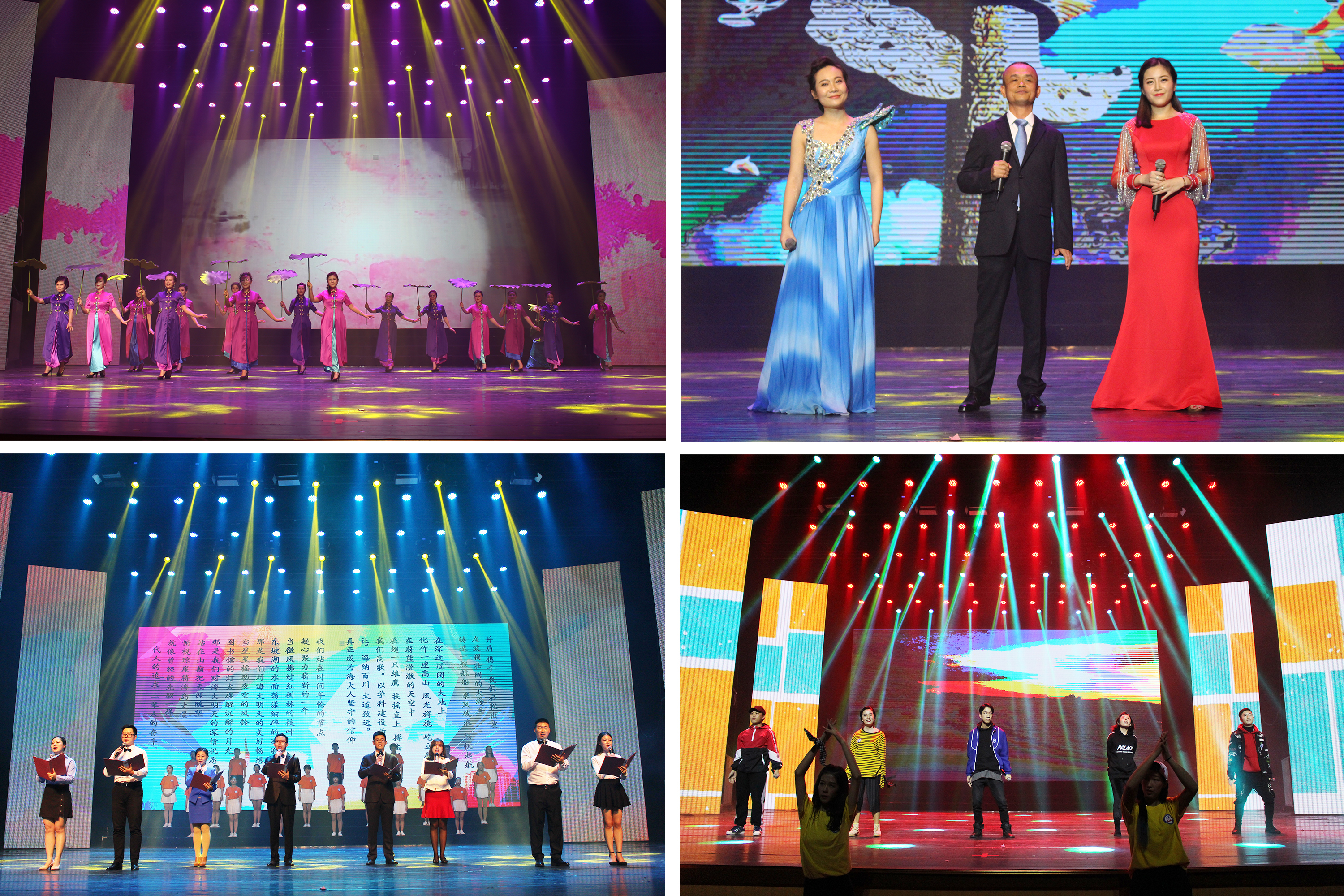 晚会在歌伴舞《母亲是中华》的载歌载舞中拉开序幕。晚会节目精彩纷呈,共分为不忘初心、共奏华章、筑梦未来三个篇章,涵盖了歌曲、舞蹈、相声、走秀、配乐诗朗诵等多种形式。PA视讯集团网站工会带来的旗袍秀《采薇》袅娜曼妙,彰显了中国古典的魅力;大合唱《我的祖国》《我爱你,中国》唱出了歌颂祖国、谱写新篇章的激昂;极具流行元素的歌曲《海大有嘻哈》唱出了新时代的青春力量,赢得师生的青睐。《风中的胶林》展现了鲜明的地域特色,传达了活泼、热烈的浪漫风情;舞蹈《陶魂》,也让人目不暇接,惊叹于舞者的技艺;舞台剧《最后的黑冠猿》,是舞蹈与环境的融合,是黑冠猿的祈求和呐喊,更是人类心灵与自然的共鸣。此外,歌伴舞《追寻》,诗朗诵《不忘初心跟党走,扬帆起航新时代》、相声《学歌曲》等节目都精彩非凡,深受师生的喜爱,时时掌声雷动,现场高潮迭起。