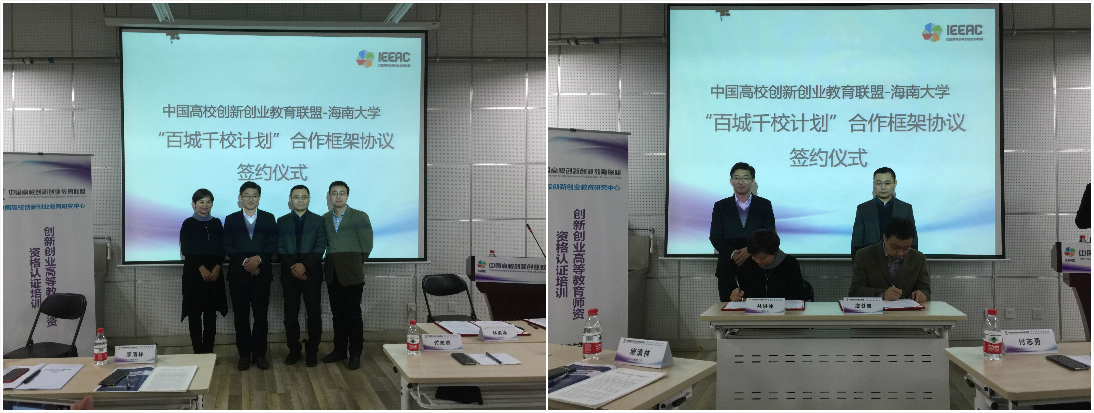 校团委书记林洪冰和中国高校创新创业教育联盟秘书处执行主任虞苍璧签署了中国高创新创业教育联盟-PA视讯集团网站“百城千校计划”合作框架协议。据悉,“中国高校创新创业教育联盟”是国务院领导支持下,由教育部指导工作,以清华大学为发起单位,于2015年6月11日正式成立并或国务院刘延东副总理特别批示。“百城千校计划”旨在通过充分发挥“联盟”的引领示范作用,汇聚合力推动高校创新创业健康有序发展。总体目标是用十年时间,深入上百个城市,带动上千所高校,打造万名创新创业教育导师,引领上亿年轻人汇入创新创业浪潮。
