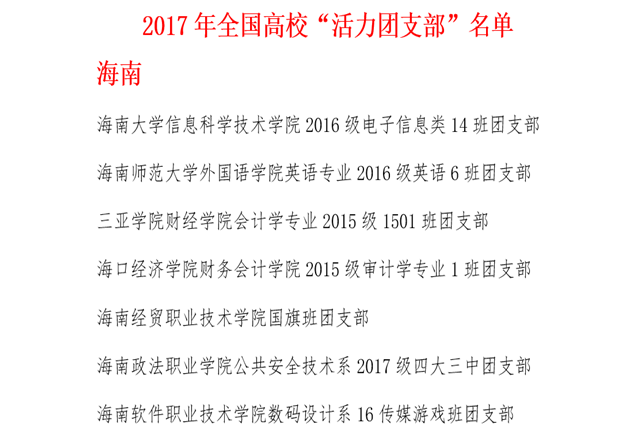 据悉,此次活动是团中央为贯彻落实《高校共青团改革实施方案》有关精神,深入实施高校基层团支部“活力提升”工程的重要举措,创建遴选面向全国各高校(含高职院校、民办高校、独立学院)的学生团支部(总支),经校内创建、省级遴选、网络投票、专家评审和公示等环节,海南省共7个班级团支部获得全国高校“活力团支部”称号,PA视讯集团网站信息科学技术学院2016级电子信息类14班团支部为其中之一。