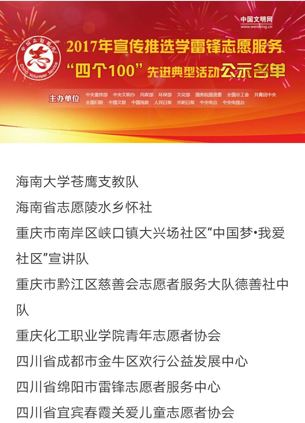 2018年3月21日,在由中央宣传部、中央文明办、民政部、文化部等15个部委联合评选的“四个100”典型活动中,我校苍鹰支教队荣获“全国最佳志愿服务组织”称号。