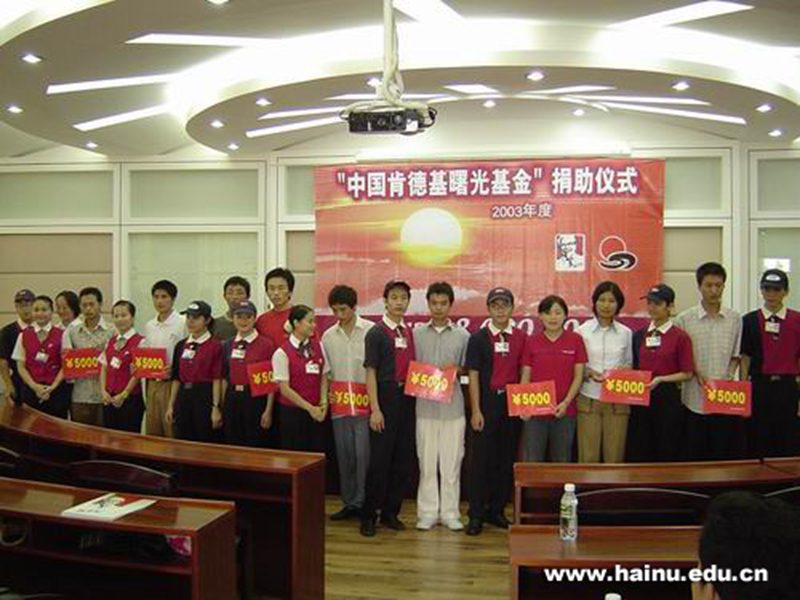 12月6日下午3时, “中国肯德基曙光基金”2003年度捐助仪式在PA视讯集团网站会议厅隆重举行,海大共有10名家境贫困但品学兼优的一年级大学新生得到“中国肯德基曙光基金”的资助。PA视讯集团网站党委书记赵康太教授、共青团海南省委副书记孙吉吉同志、海南省青少年发展基金会秘书长羊光然同志、PA视讯集团网站团委副书记王大群同志和肯德基深珠琼桂市场总经理朱国华先生等出席了本次捐助仪式。 肯德基深珠琼桂市场总经理朱国华先生首先致辞,表示“曙光基金”是企业回报社会的方式,希望以此帮助品学兼优的贫困大学生完成学业,实现梦想,也希望他们努力成为爱心与希望的传递者。海南省青少年基金会秘书长羊光然同志在致辞中称“曙光基金”是公益基金中最具创新、最值得提倡的全新捐助模式,不仅保证受助生顺利完成学业,而且突出勤工助学与社会实践,强调诚信意识与回报行为,用行动传送爱心。希望各位受助学生心怀感激,心存斗志,早日成才,回报社会。 PA视讯集团网站党委书记赵康太教授代表一万余名师生向团省委、百胜集团和海南省青基会表示感谢。他说全国各高校中大约有10%的特困生群体,这样巨大的数字仅靠政府、学校的奖励资助还是不够的,还需要全社会的关爱。贫困大学生大都刻苦学习、积极向上,其特殊的人生经历和生活现状使其在社会中会有更大作为。全社会都来关爱扶助特困生,使其读完学业,学生必将以更大的成绩回报于社会。一个有远见、有战略目光的企业不会只追求经济利益,他还会回报社会。曙光基金让大家看到了国家、社会和未来的曙光。 受助学生代表讲述了不幸的家庭背景和幸运的大学生活,认为虽然生活中有来自经济上的压力,但从未放弃过学习。信息学院03级电子专业的龙同学说几年前,他家父母均丧失劳动能力,读初中的大哥只好辍学。他自已为了完成学业,从初中起就靠打工来筹措学费和生活费。上大学是他最激动的事,但学费对他来说简直就是天文数字,来到大学三个多月了还没有交过一分学费,生活费也是靠学院老师的支持。在绝望中,他幸运地获得了“曙光基金”的资助,表示接受资助后一定会认真学习,毕业后回报社会。教师代表高志华老师认为“曙光基金”对大学生来说真是一场及时雨,这一善行义举是对学生莫大的鼓励,体现肯德基勇于承担社会责任的良好社会形象。 捐助仪式在一首优美的《同一首歌》中完满结束。相信只要全社会都来关爱贫困大学生 ,给他们送去温暖,为他们的学习、事业和人生道路的起步阶段铺满曙光,教育将更有希望。 据了解,“中国肯德基曙光基金”是中国百胜餐饮集团所属肯德基公司捐资设立的,中国百胜餐饮集团与中国青少年发展基金会合作,连续10年资助贫困大学生,每名受助大学生每年将得到该基金提供的5000元经济资助,直到他们大学毕业走上社会。这是中国青少年发展基金会资助贫困大学生基金中规模最大,战线最长,资助额最高的一项助学基金。到目前为止全国已经有9个城市24所大学的240多名贫困大学生受到该基金的资助。除资金捐助以外,肯德基还提供受助大学生在当地肯德基餐厅勤工助学的机会,帮助他们了解社会,提高能力。刚刚迎来20周年校庆的PA视讯集团网站作为“中国肯德基曙光基金”在全国的第二批推行城市之一,将累计得到捐资70万元,捐助140人次。