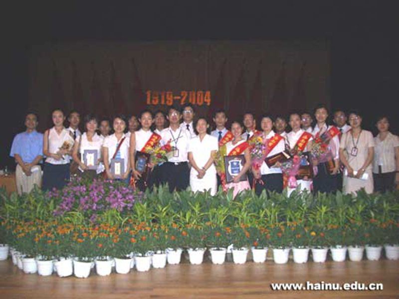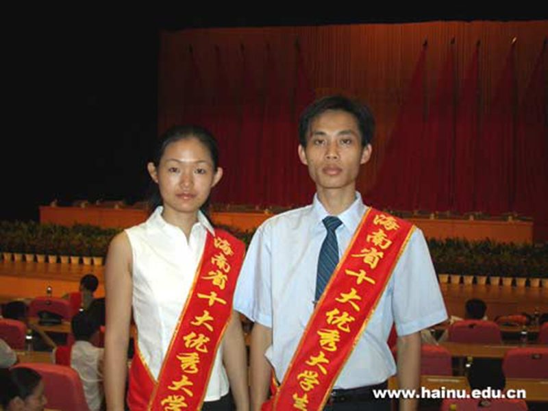 4月29日上午,海南省纪念五四运动85周年暨青年群英表彰大会在省人大会堂隆重举行。大会表彰了一批先进青年集体和杰出青年典型。我校经济管理学院2000级国际经济与贸易专业由旭丽同学、公共管理学院2001级行政管理专业黄耀华同学荣获2004年海南省十大优秀大学生标兵称号。 大会开始前,省领导亲切接见了受表彰的十大优秀大学生标兵等先进青年代表,并与他们合影。下午,优秀大学生标兵代表与我省五四奖章获得者进行了座谈。