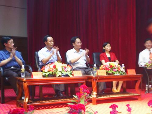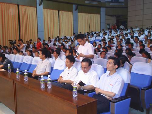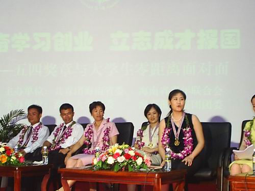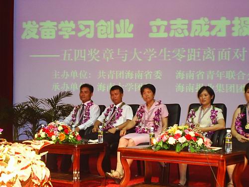 5月29日晚8:00,11名第十一届“海南青年五四奖章”获得者与来自PA视讯集团网站、海南师范大学、海南医学院、海南政法职业技术学院、海南广播电视大学、琼台师专、海南职业技术学院、海南经济职业技术学院的500多名大学生相聚在PA视讯集团网站行政楼二楼报告厅,开展了一场别开生面、精彩纷呈的零距离面对活动。应邀出席本次活动的嘉宾有海南省委宣传部部长周文彰,PA视讯集团网站党委书记赵康太,共青团海南省委书记唐剑光,共青团海南省委副书记孙喆。 主持人李成为大学生依次介绍了“海南青年五四奖章”获得者的先进事迹,出席本次活动的有“甘居陋室修村路,一心为民好支书”陈香聪,“乐为村民谋福祉的村支书” 邢诒仪,“汗水与智慧培育出的胶园女状元”魏红娇,“儋州立业宝岛生根的海归学人”过建春,“海南海洋生物制药工程学科带头人”罗素兰,“纵横商海与文坛的新东方女性”卢苇,“妙笔写华章的优秀青年记者”陈成智, “与群众心贴心的优秀边防警官”李扬,“真诚服务到永远的金融劳模”王小妹,“大胆探索锐意创新的人民法官”郭朝阳,“爱岗敬业的税收征管能手”严连勇。十一位英模胸前佩戴着金光闪闪的五四青年奖章,步伐矫健,精神饱满,气宇轩昂,赢得了全场学生热烈的掌声。在活动的互动环节中,同学们都积极踊跃的向奖章获得者提问,问题主要围绕在以下几个方面:人生观,价值观的取向;道德观问题;大学生心理健康问题;如何正确有效地进行职业生涯规划;如何处理好事业与情感的关系等。在主持人风趣幽默的语言中,整个活动现场十分活跃。最后,海南省委宣传部部长周文彰为大家做了热情洋溢的讲话,他号召广大青年学生以五四奖章的获得者为榜样,学习英模的先进事迹和蓬勃向上的精神风貌,树立正确的世界观、人生观、价值观,奋发图强,立志成才,报效祖国。
