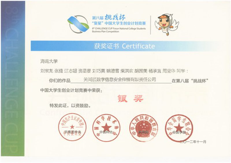 附:获奖名单第八届“挑战杯”中国大学生创业计划竞赛银奖(1件)《无间盗数字信息安全传播有限责任公司》(由信息学院牵头报送)