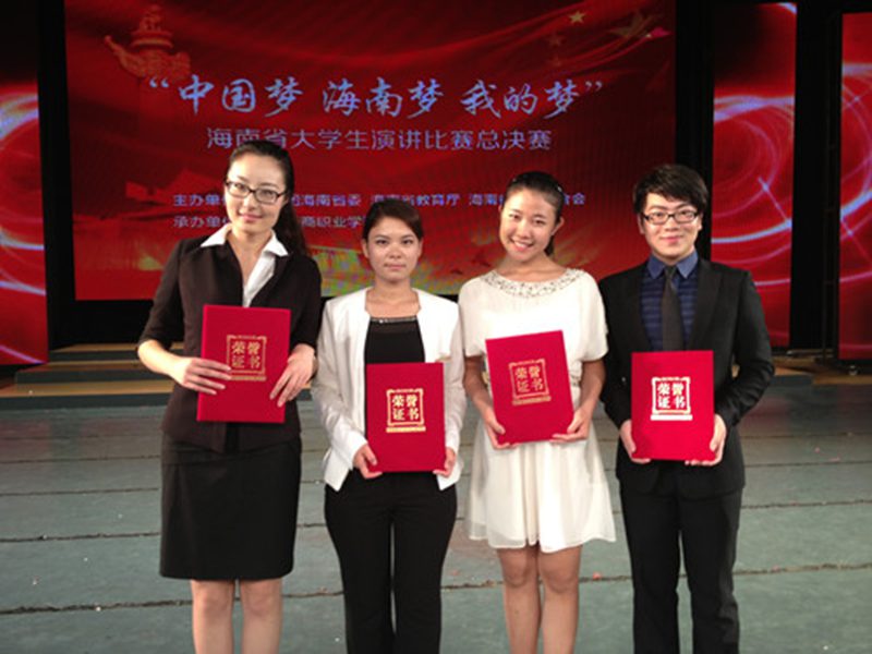 “中国梦 海南梦 我的梦”海南省大学生演讲比赛由共青团海南省委、海南省教育厅、海南省学生联合会共同举办。本次大赛历时1个月,全省共有18所高校3730个团支部约四万余名团员青年参与。通过全省高校层层选拔,共选出15名选手进行决赛角逐。本次演讲比赛决赛于2013年5月11日晚八时在海南工商职业学院大礼堂举办,共青团海南省委盖文启书记、党组成员罗桦和海南省教育厅袁陵南副巡视员出席本次活动。 本次比赛共评出一等奖1名、二等奖3名、三等奖6名、优秀奖5名。我校共有4名同学进入决赛,并以精彩的演讲征服了现场评委和全场观众,取得优异成绩: