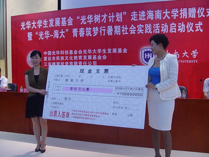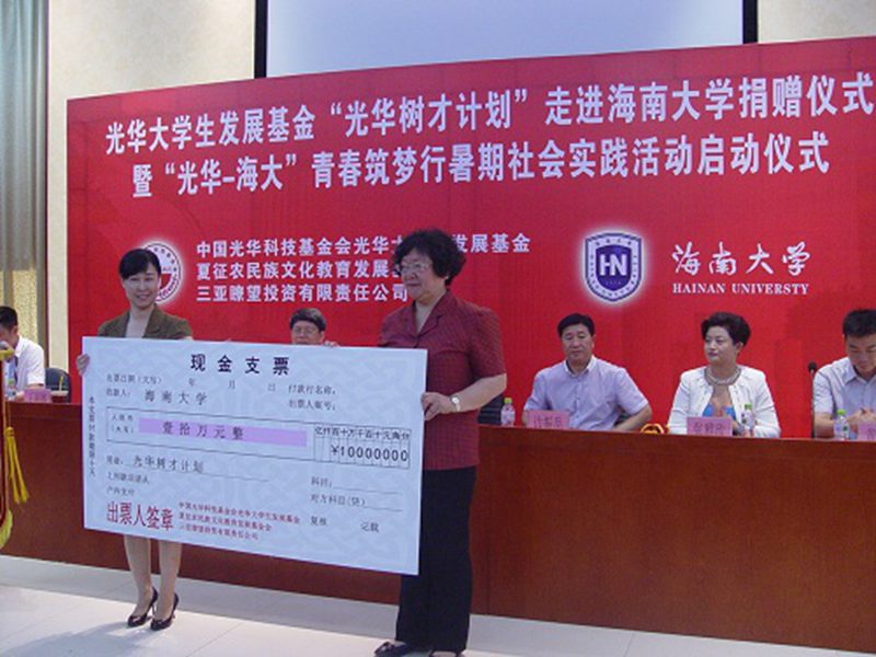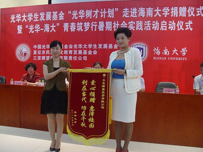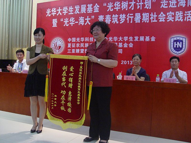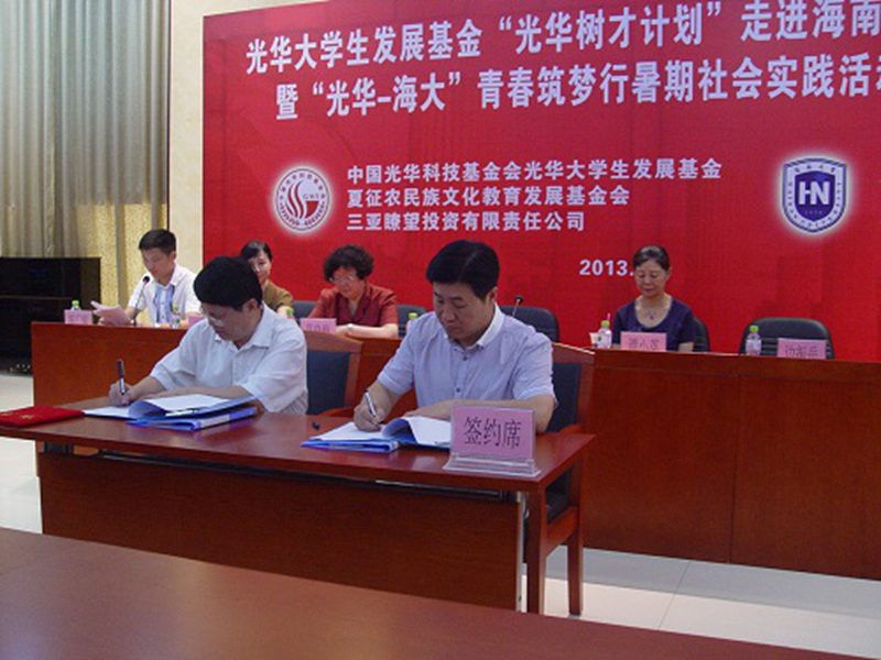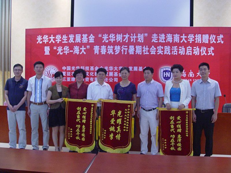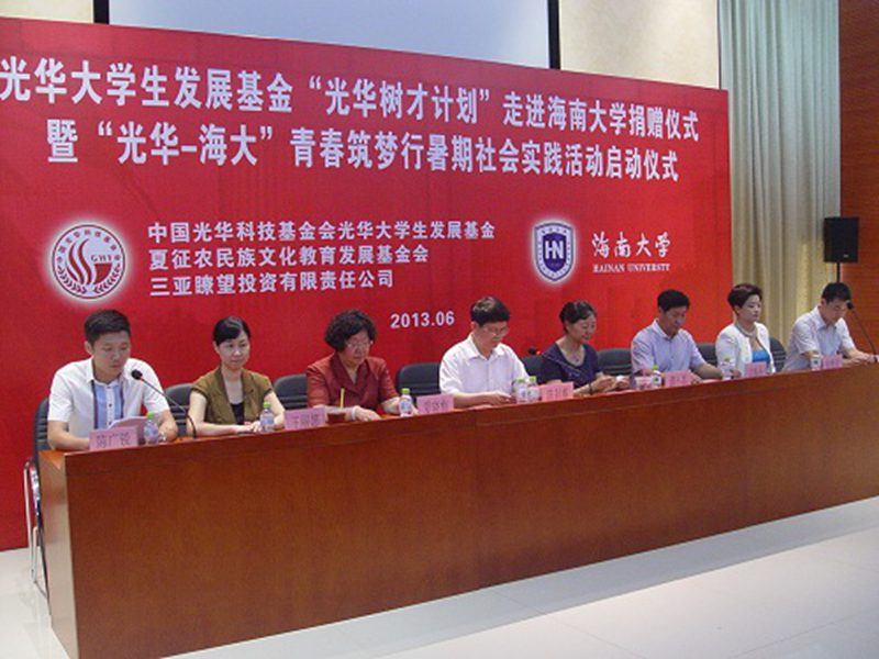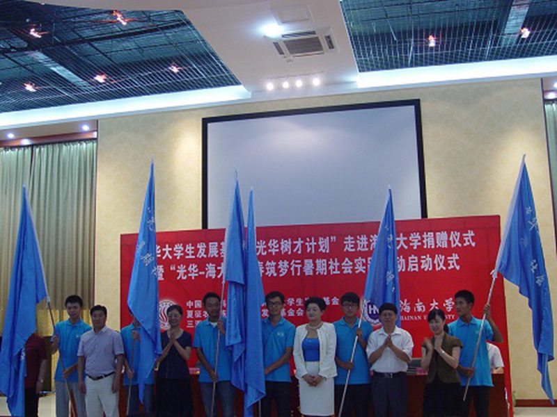 2013年6月27日上午,光华大学生发展基金“光华树才计划”走进PA视讯集团网站捐赠仪式暨“光华-海大”青春筑梦行暑期社会实践活动启动仪式在我校思源学堂A101多功能厅成功举行。中国光华科技基金会光华大学生发展基金顾问、国务院参事室研究员谭小英女士,中国光华科技基金会光华大学生发展基金执行理事长兼秘书长边振岳先生,中国光华科技基金会光华大学生发展基金顾问、夏征农民族文化教育发展基金会理事长夏晓梅女士,中国光华科技基金会光华大学生发展基金爱心大使、三亚瞭望投资有限责任公司副董事长张雅欣女士,我校党委副书记陈封椿教授,校团委书记王丽娜博士,校团委副书记黄小欧老师,校团委副书记陈广锐老师等嘉宾领导出席了此次活动。我校100余名师生代表参加了本次活动。此次活动由校团委副书记陈广锐老师主持。