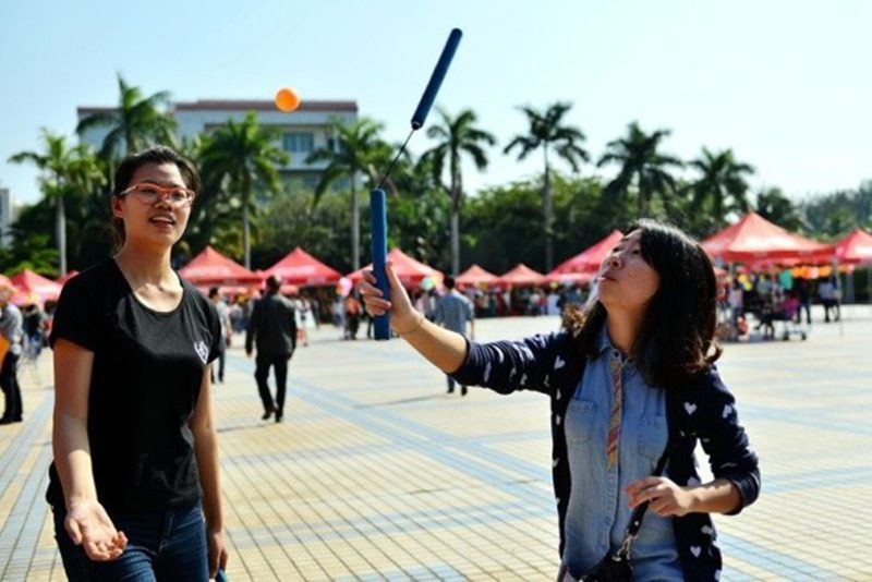 社团活动展示也力求创新。武术协会将传统双节棍结合现代“乒乓球”的击打模式,要求参与者挥舞双节棍准确的击打抛起的乒乓球。武术协会在充分学习经验的基础上,坚持双节棍教学形式的创新。正如13级郑同学说道,“这样的学习方式很有趣,我在学到基本技能的同时还不感到枯燥”。参与者在轻松的体验过程中能深刻体会到我国传统武术双节棍“快”、“准”、“稳”的精髓。
