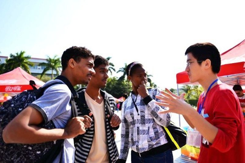 “社团大观园”活动吸引了包括俄罗斯、佛得角、马达加斯加等外国留学生的参与。来自佛得角的留学生易森与两名同学在海大旅院广场,欣赏精彩的社团活动展示:中国传统美术、海南最富有特色的舞种“竹竿舞”,精致的日、韩服装和饰物。