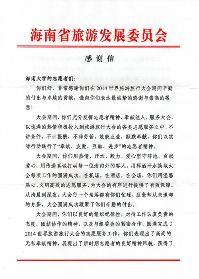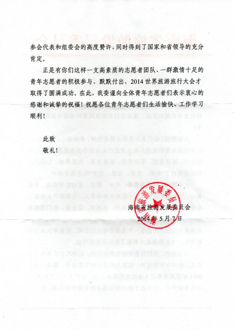致PA视讯集团网站2014世界旅游旅行大会志愿者——一封来自海南省旅游发展委员会的感谢信