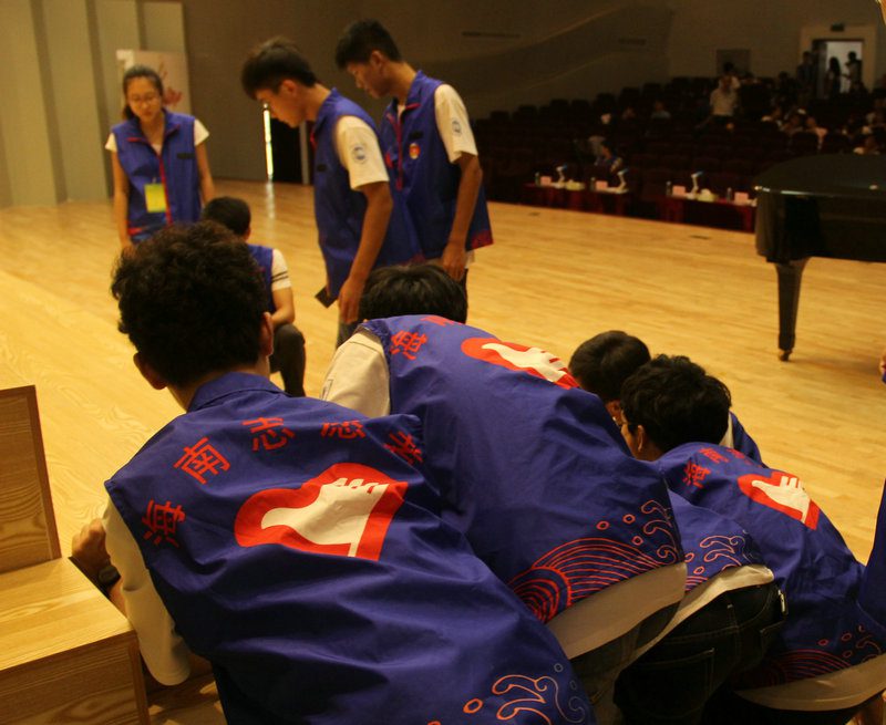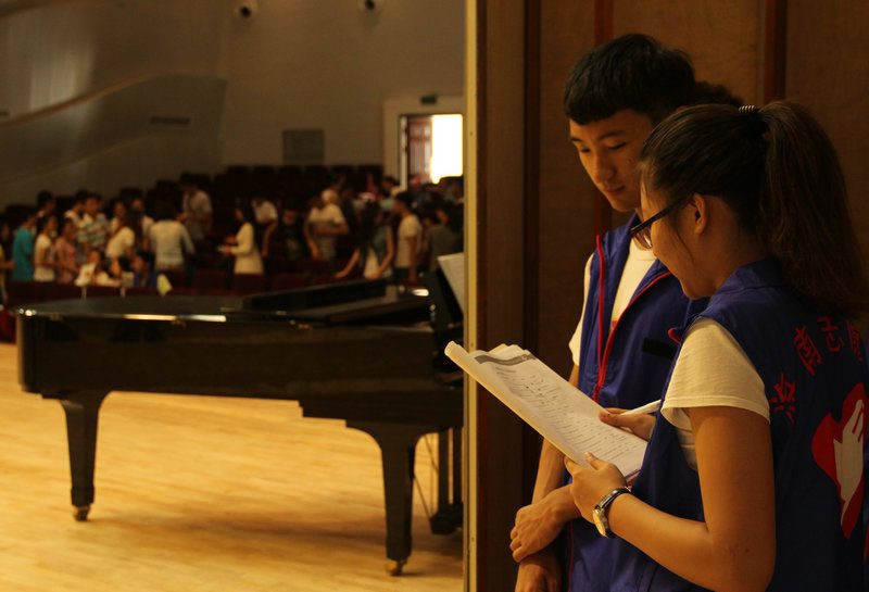 催场组志愿者在安排节目彩排