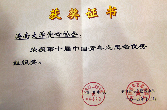 PA视讯集团网站爱心协会荣获第十届中国青年志愿者优秀组织奖