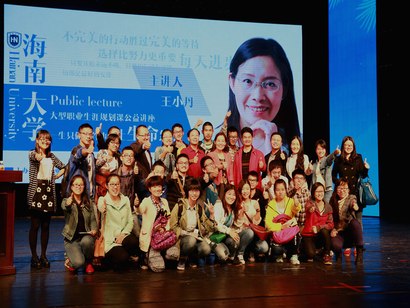 王小丹老师在演讲中注重与在场学子互动,并准备有趣的测试,旨在让学员明白“注意力在哪里,结果在哪里”这一人生哲理。通过丰富的人生阅历把人生规划分为社会,家庭,事业,个人四个方面。最后,她向在场的学子提出殷切希望:在大学中应该要做到“读10本好书”、“拥有一技之长”、“每月给父母打两个电话”、“职业探索,积累职场经验”、“成为一个超牛的团队一员”、“每年参加公益活动两次”、“自助旅行一次”、“有三五知己”等八件事。