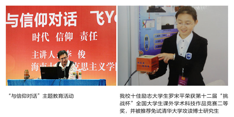 海大共青团始终将大学生思想引领作为共青团工作的基础,通过举办报告会、专题讲座、研讨会、分享会等主题团日活动,利用校报、校广播台、新媒体等途径,深入开展中国特色社会主义和“中国梦”等主题教育活动,站在理想信念的制高点上,引导广大团员青年学生爱学习、爱劳动、爱祖国,树立正确的世界观、人生观、价值观,增强对中国特色社会主义的理性认同和自觉践行,培育和践行社会主义核心价值观。