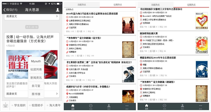 依托“海大思源”等现有媒体平台,Myouth已成为PA视讯集团网站开展共青团工作的新利器,学生不仅可以在线报名、关注、评论活动,还可以实现在线投票、接收通知等强大的互动功能。至2015年 1月,Myouth平台建设四个月以来,共150个团学组织和学生社团进行入驻,关注人数13000人,发布资讯总数274条、活动总数253条(截止2015年1月1日)。Myouth平台精彩活动最高浏览量达33944人次,累计活动浏览量达131470次,Myouth平台的建设和推广卓有成效。