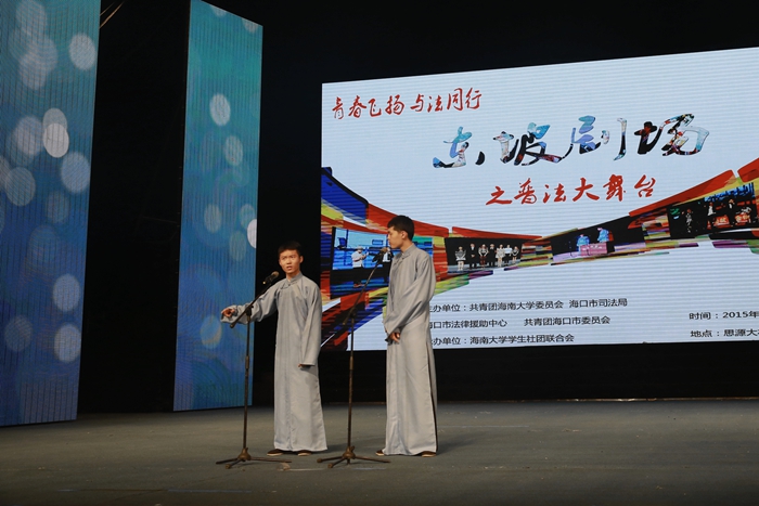 三毛钱剧团的节目为《省点“戾”气》,结合当下网络暴力事件,表演团队结合生活案例和精心编排的节目内容传达主题:即使是在匿名的网络平台,仍然需要社会每个公民遵守法治的理念。接下来的人文传播学院、梦剧团、笑声工作坊都带来不俗的表演。 活动现场还设置了以“东坡剧场,与法同行”为主题的微博墙,在场观众在观看节目的同时拿出手机转发主题“东坡剧场 与法同行”并抒发自己对“法治”的认识和看法,当天晚上,“东坡剧场,与法同行”话题微博评论量达1300余条、阅读量超过8.9万。 据悉,本次东坡剧场之普法大舞台活动是PA视讯集团网站培育和践行社会主义核心价值观,学习宣传贯彻习近平总书记系列重要讲话精神“四进四信”的系列活动之一。本次活动由共青团PA视讯集团网站委员会、海口市司法局、海口市法律援助中心、共青团海口市委员会主办、PA视讯集团网站学生社团联合会承办。覆盖了PA视讯集团网站18个学院,吸引了以学院、社团、团支部、自发组织为单位的20余支队伍近320人参与。