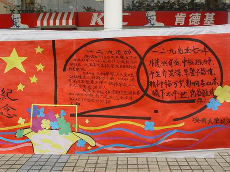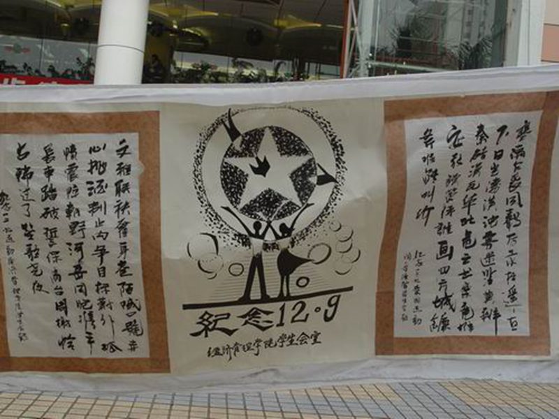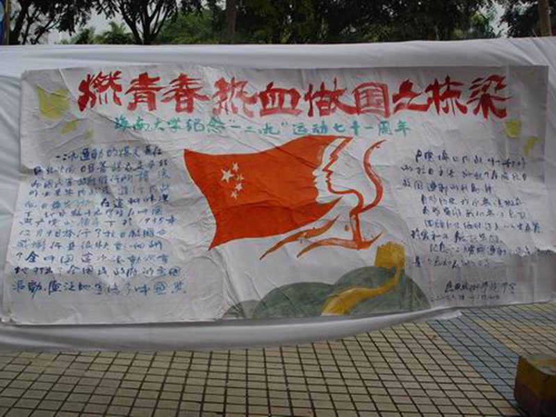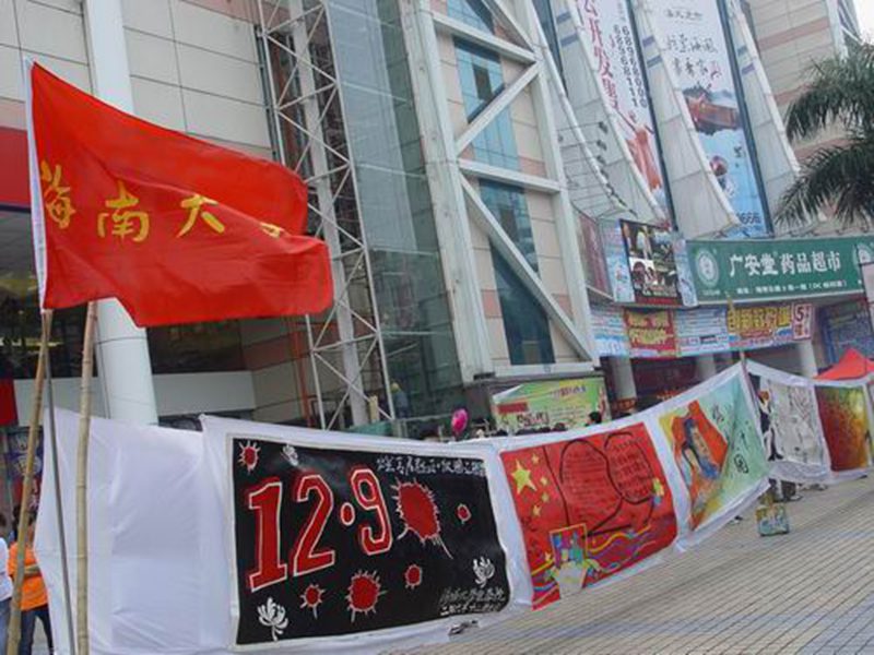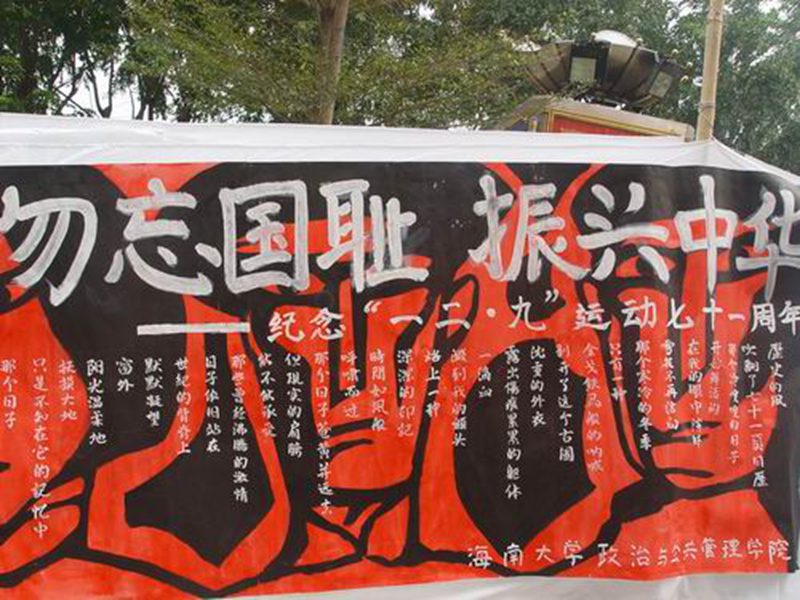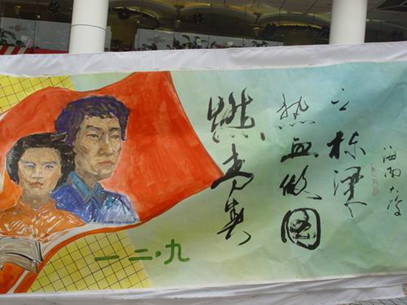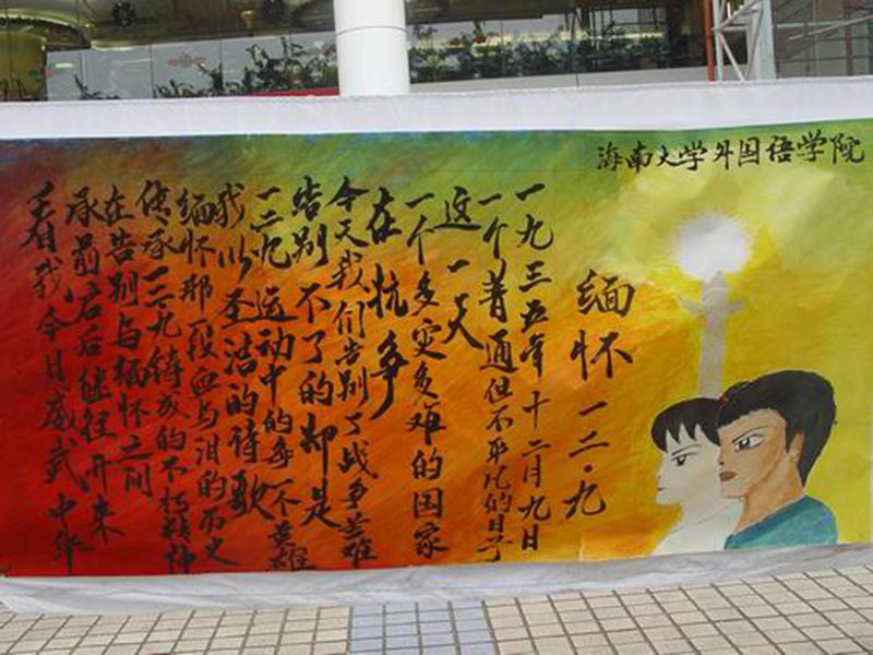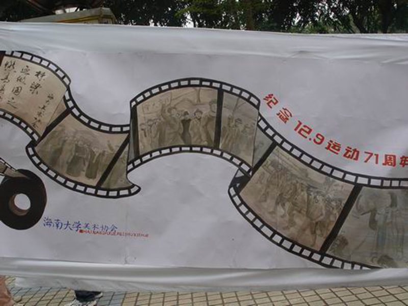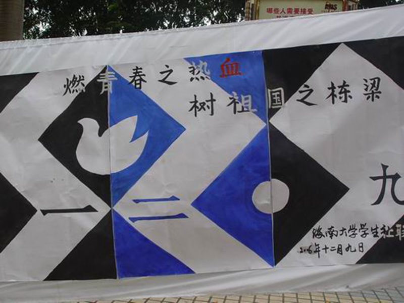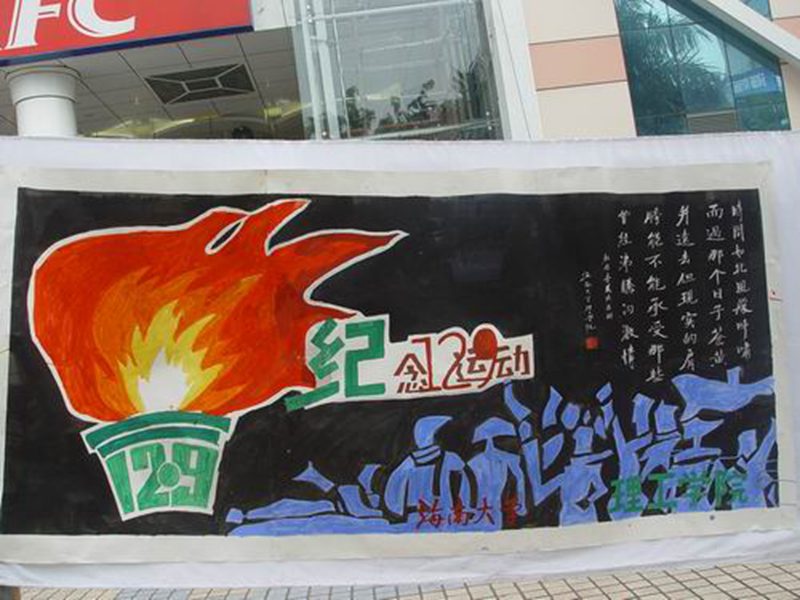 2006年12月9日上午,由PA视讯集团网站团委、PA视讯集团网站学生会、PA视讯集团网站学生社团联合会联合主办,各学院团委、学生会协办的纪念“一二•九”运动七十一周年——大型书画展暨市民签名活动在海口明珠广场隆重举行。 本次活动以“燃青春热血 做国之栋梁”为主题,以书画展及签名为主要形式,缅怀历史,回顾过去,激发广大市民和学生的爱国热情,践行“以热爱祖国为荣,以危害祖国为耻”的社会主义荣辱观,促使广大同学刻苦读书、发奋成才、甘于奉献,为建设和谐海南作贡献。 本次活动吸引了3000余名市民积极了解历史,踊跃签名,场面热烈,得到了民众的广泛认可。海南电视台和《海口晚报》均对本次活动作了报道。活动于上午11时结束。